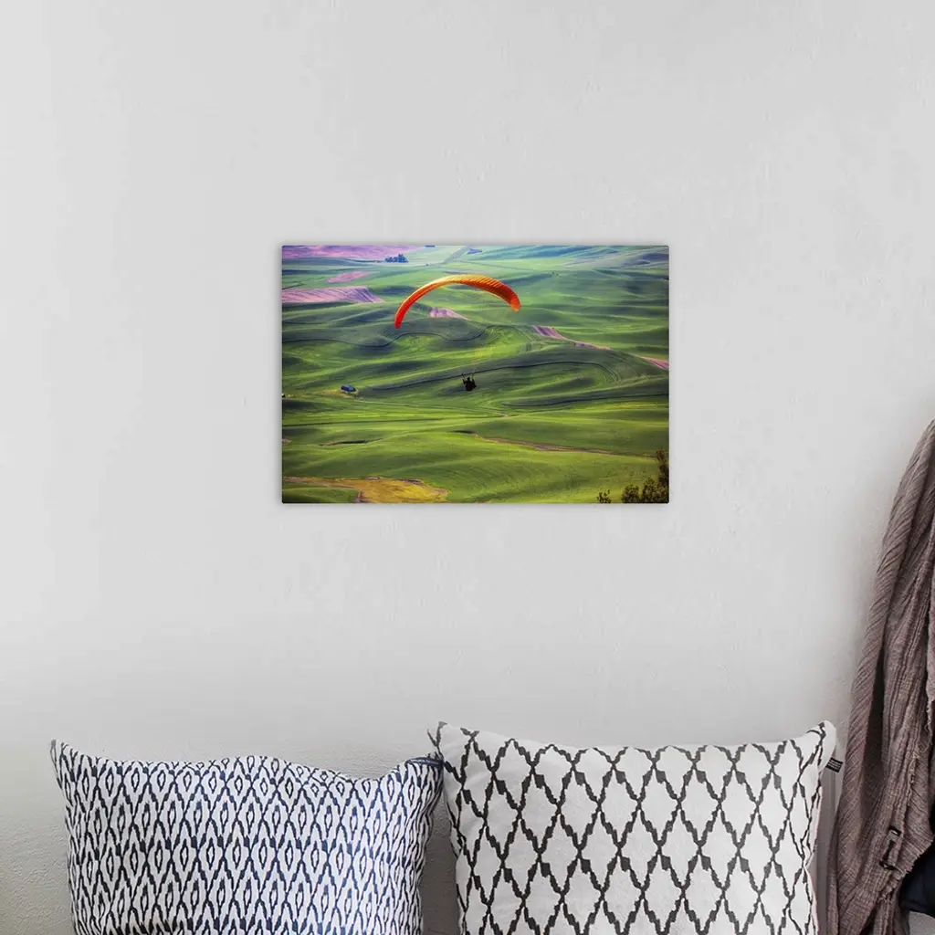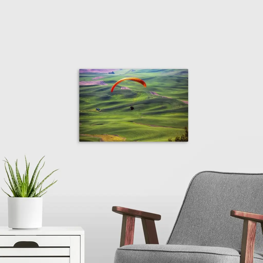 Paraglider Above Green The Wheat Fields In The Palouse Region Of Washington