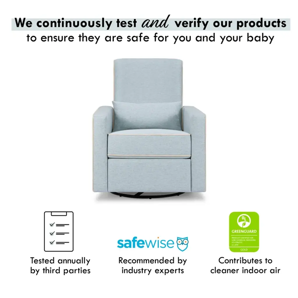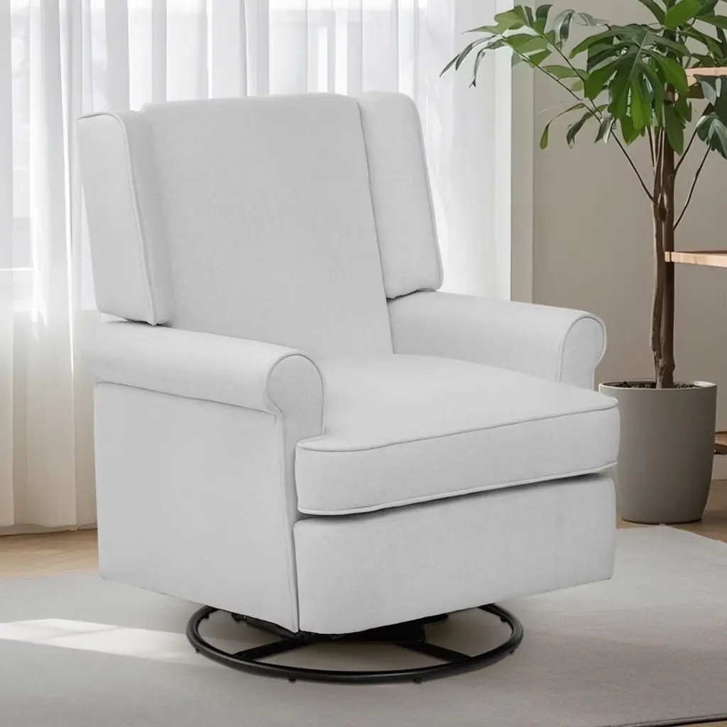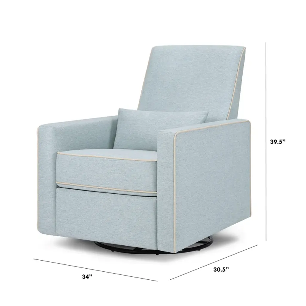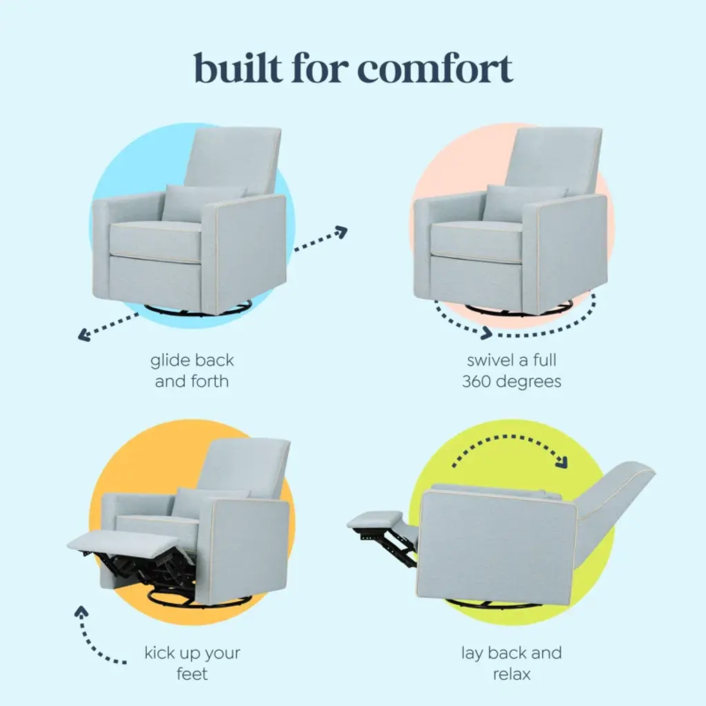 Crafted with new parents' and nursing mothers’ needs in mind, the Piper Recliner and Glider features 360 swivel motion, forward and backward gliding function and a plush pop-up leg rest to provide comfort for feeding and putting baby to rest. Its reclining mechanisms are hidden and thoughtfully within easy reach. Constructed of soft and durable heathered polyester fabric, the Piper Glider offers a timeless design and can be used well beyond the nursery years.
