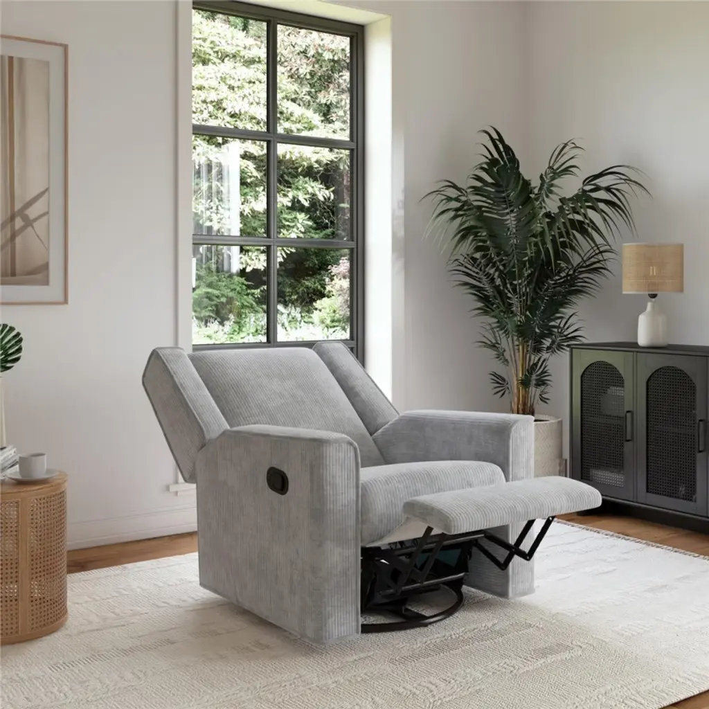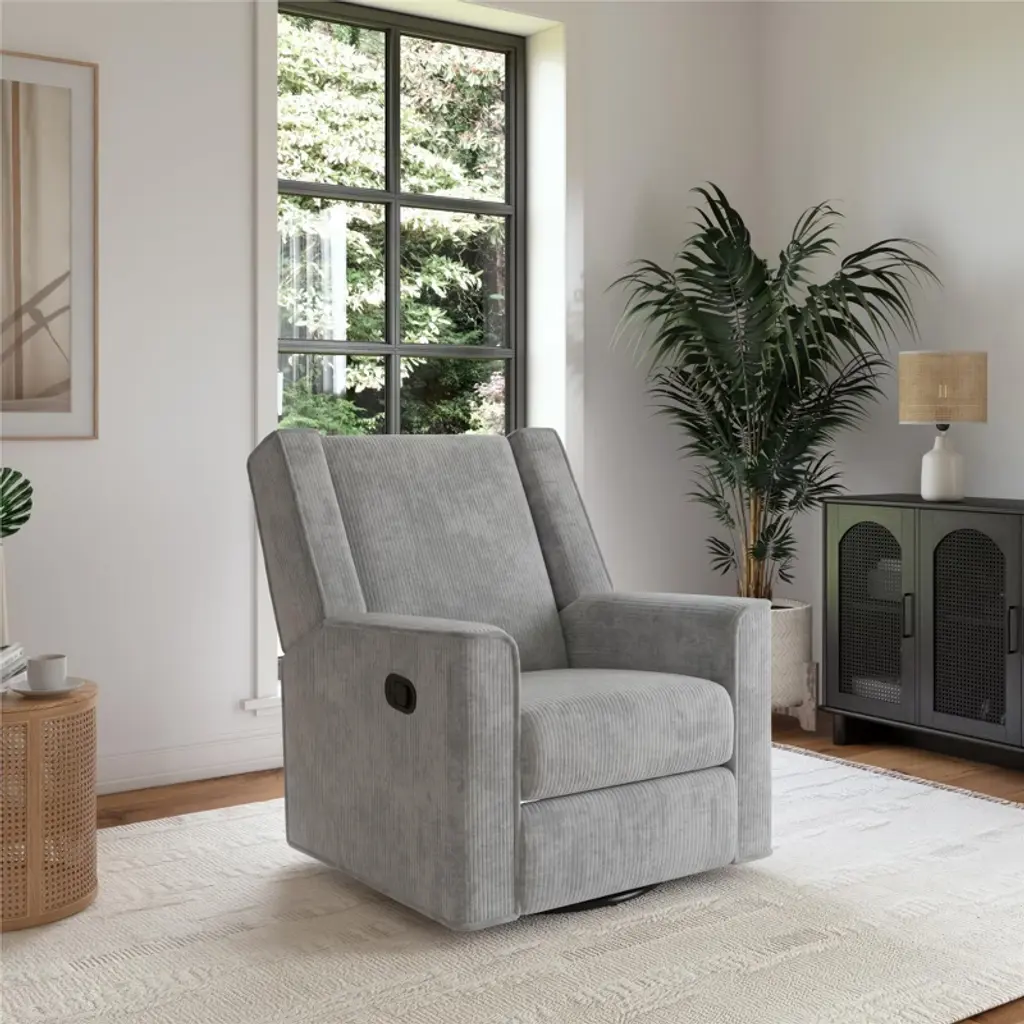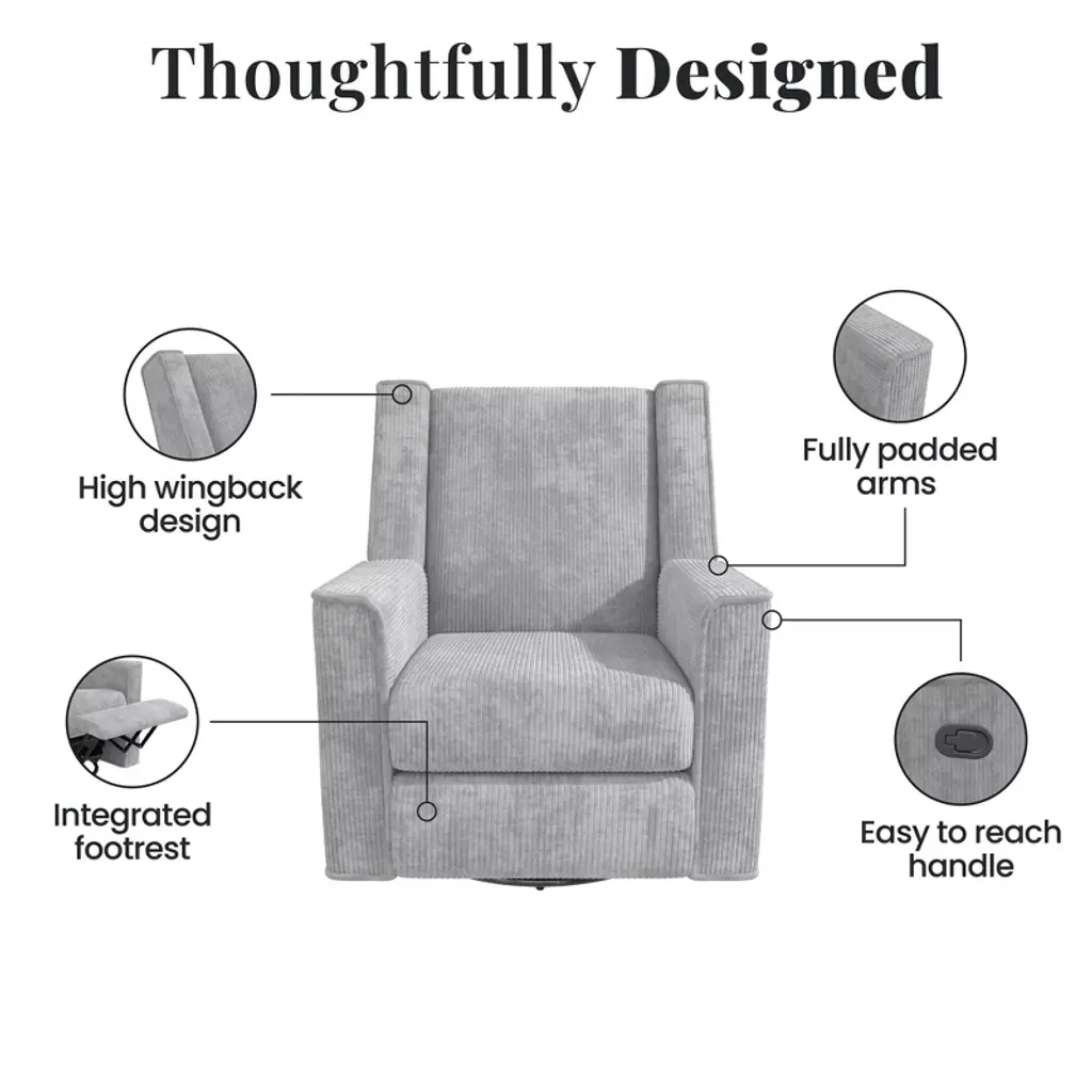 Finding balance and creating harmony in your home is easier than you think with the contemporary RealRooms Elysian Swivel Recliner Chair & Glider. Our rocker recliner chair never cramps your style or your comfort thanks to its sumptuously soft corduroy upholstery and elegant wingback profile with emphasized piping. Made for adults who appreciate quality armchair construction and small space design, this upholstered rocking recliner is ideal for living room leisure. The gentle 360-degree swiveling and gliding chair function allows for effortless use as a bedroom and home office accent chair or as a modern nursery glider chair. The skin-friendly OEKO-TEX Certified fabric is safe from harmful substances, letting you comfortably focus on the foam-filled pocket coil seat for firm relief and the tall, padded backrest for built-in neck support. The durably crafted wood frame, no-sag spring backing, steel recline system, and metal swivel base combine to enable smooth pushback reclining with a lever-operated lift-up footrest added for good measure.