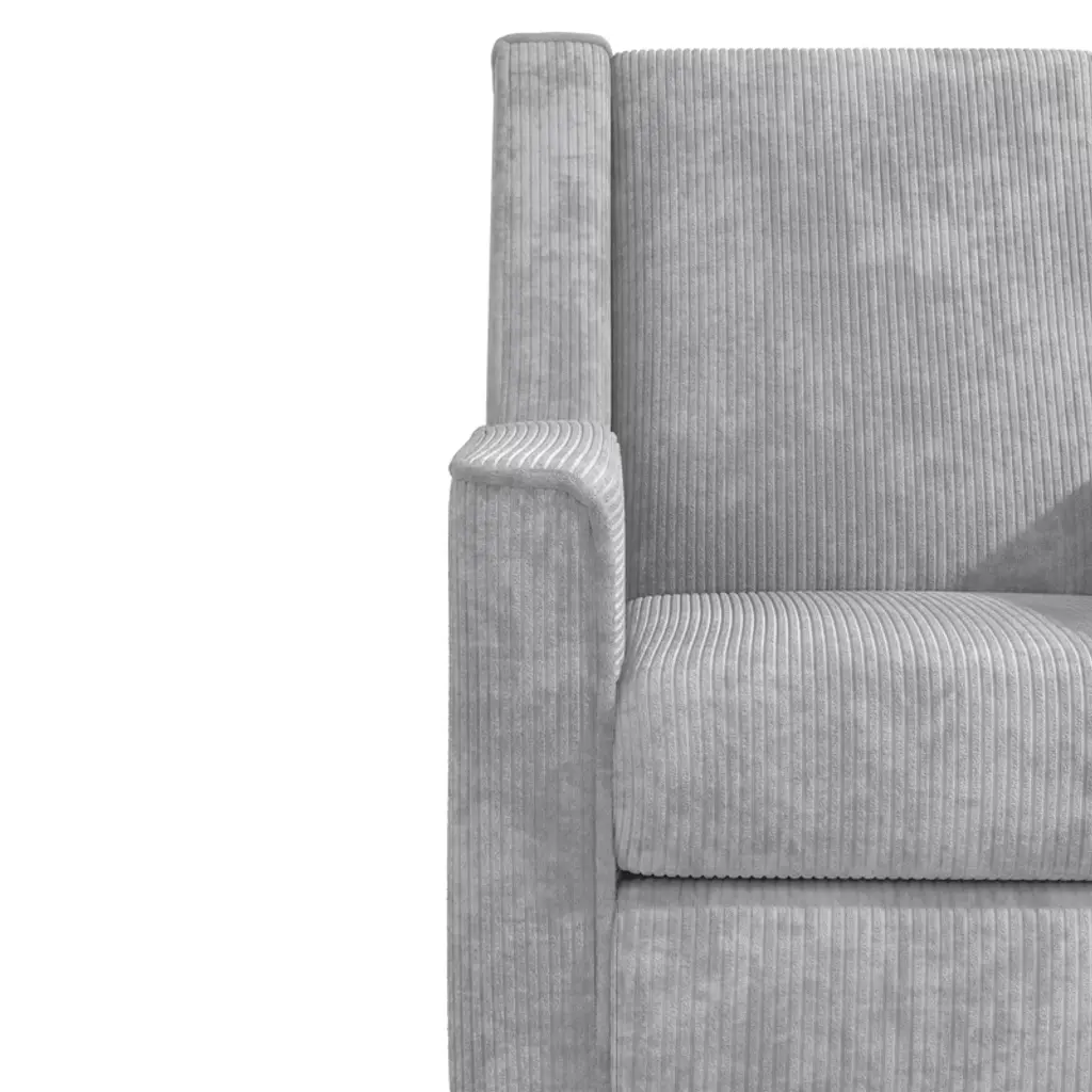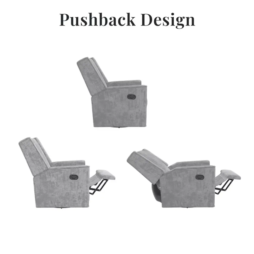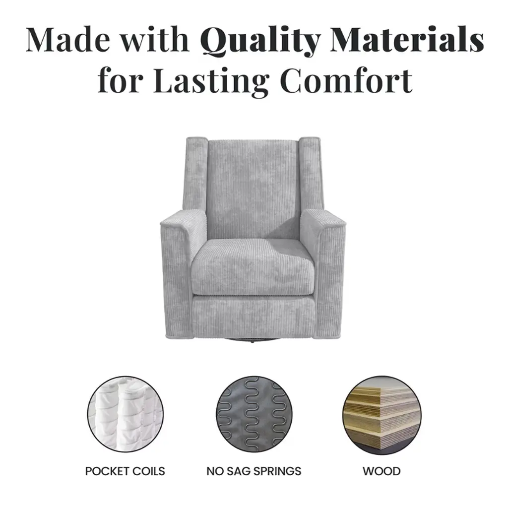 Finding balance and creating harmony in your home is easier than you think with the contemporary RealRooms Elysian Swivel Recliner Chair & Glider. Our rocker recliner chair never cramps your style or your comfort thanks to its sumptuously soft corduroy upholstery and elegant wingback profile with emphasized piping. Made for adults who appreciate quality armchair construction and small space design, this upholstered rocking recliner is ideal for living room leisure. The gentle 360-degree swiveling and gliding chair function allows for effortless use as a bedroom and home office accent chair or as a modern nursery glider chair. The skin-friendly OEKO-TEX Certified fabric is safe from harmful substances, letting you comfortably focus on the foam-filled pocket coil seat for firm relief and the tall, padded backrest for built-in neck support. The durably crafted wood frame, no-sag spring backing, steel recline system, and metal swivel base combine to enable smooth pushback reclining with a lever-operated lift-up footrest added for good measure.