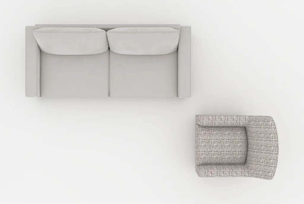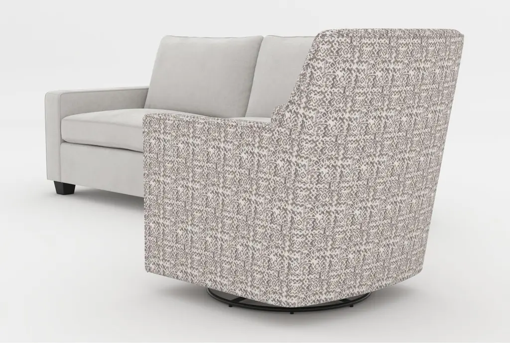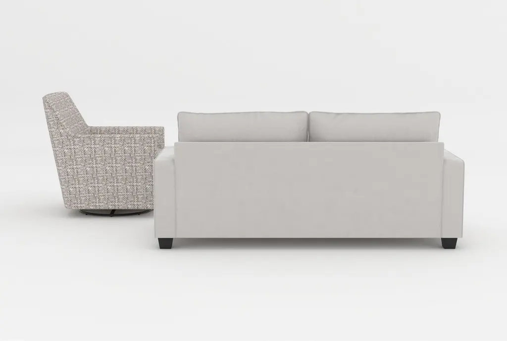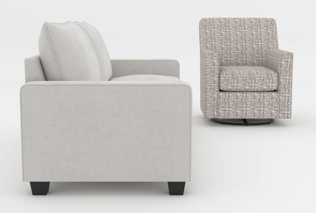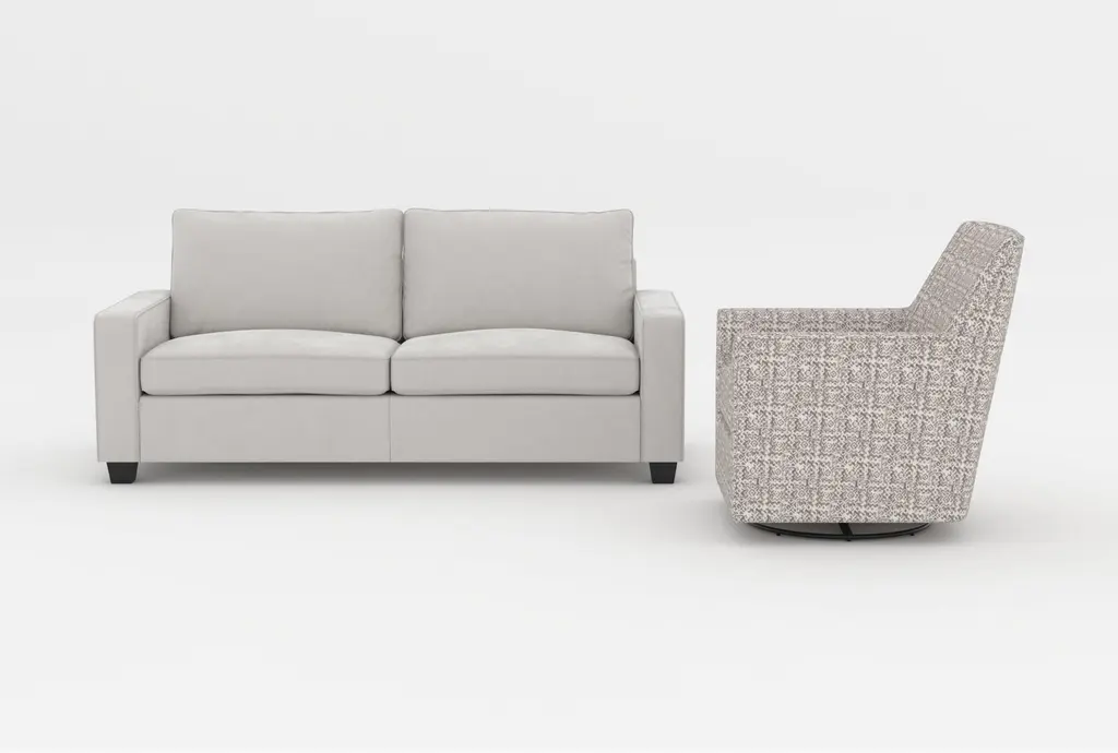 The Reid Buff Beige Fabric Sofa and Belinha II Oyster Beige Grey Fabric Swivel Glider Accent Armchair offer a contemporary touch to any living room or dorm. Made with fabric, hardwood, engineered wood, foam, and metal, this set provides a firm comfort level and is perfect for relaxation. The sleek design and functionality make them ideal for modern living spaces.