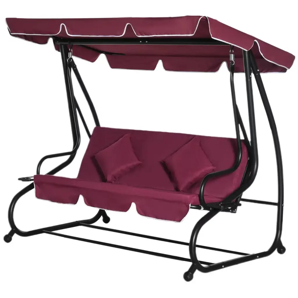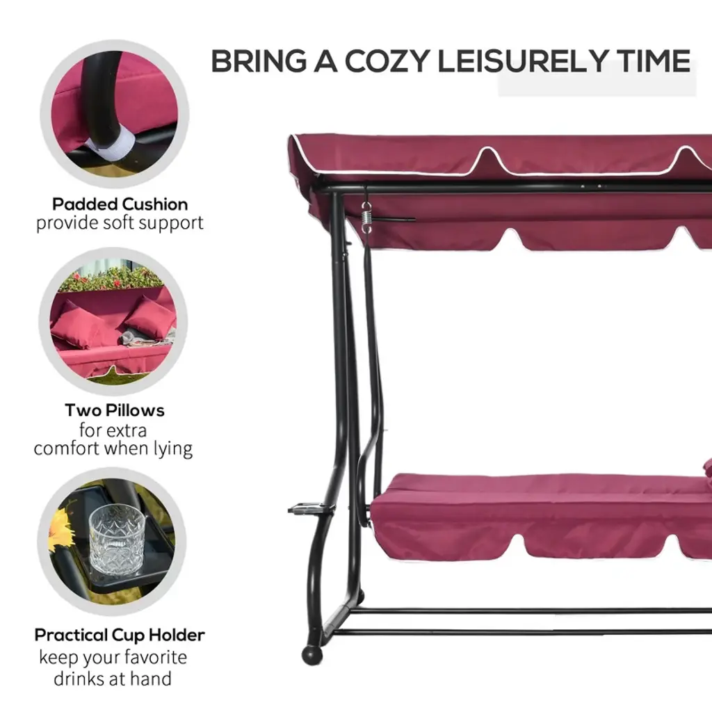 Resenkos 3-seat Swing Chair, Convertible Flatbed Glider With Adjustable Canopy, Wine Red