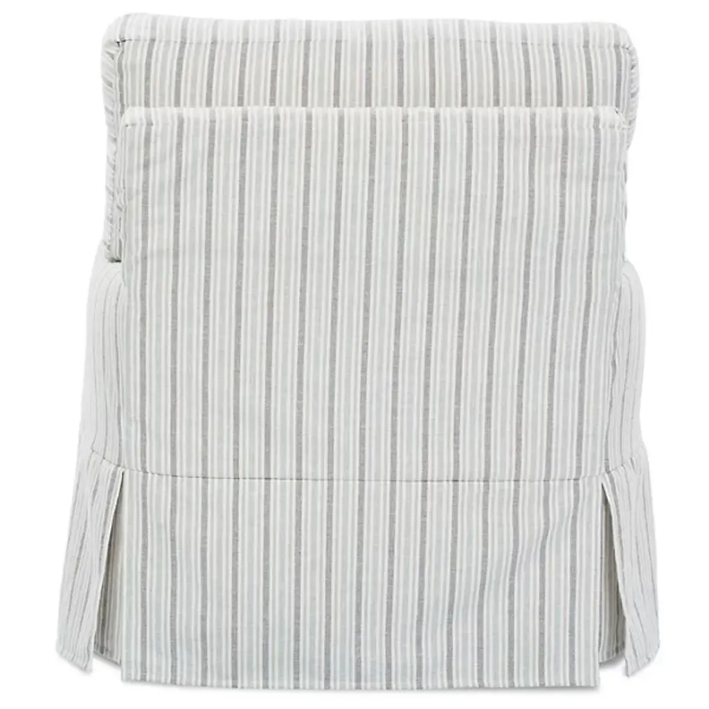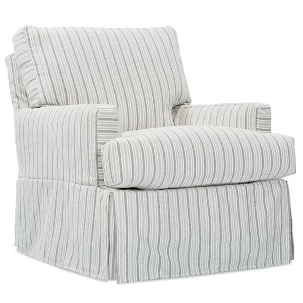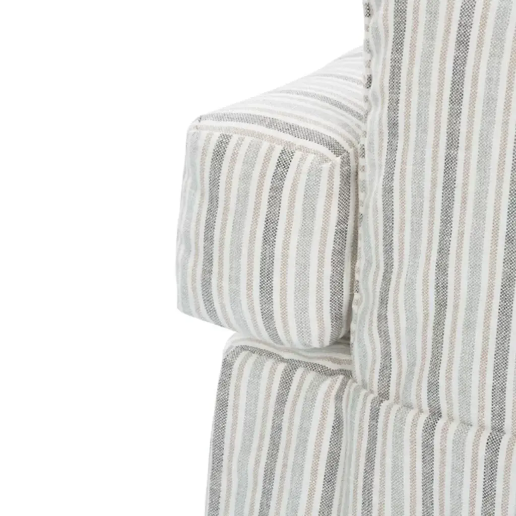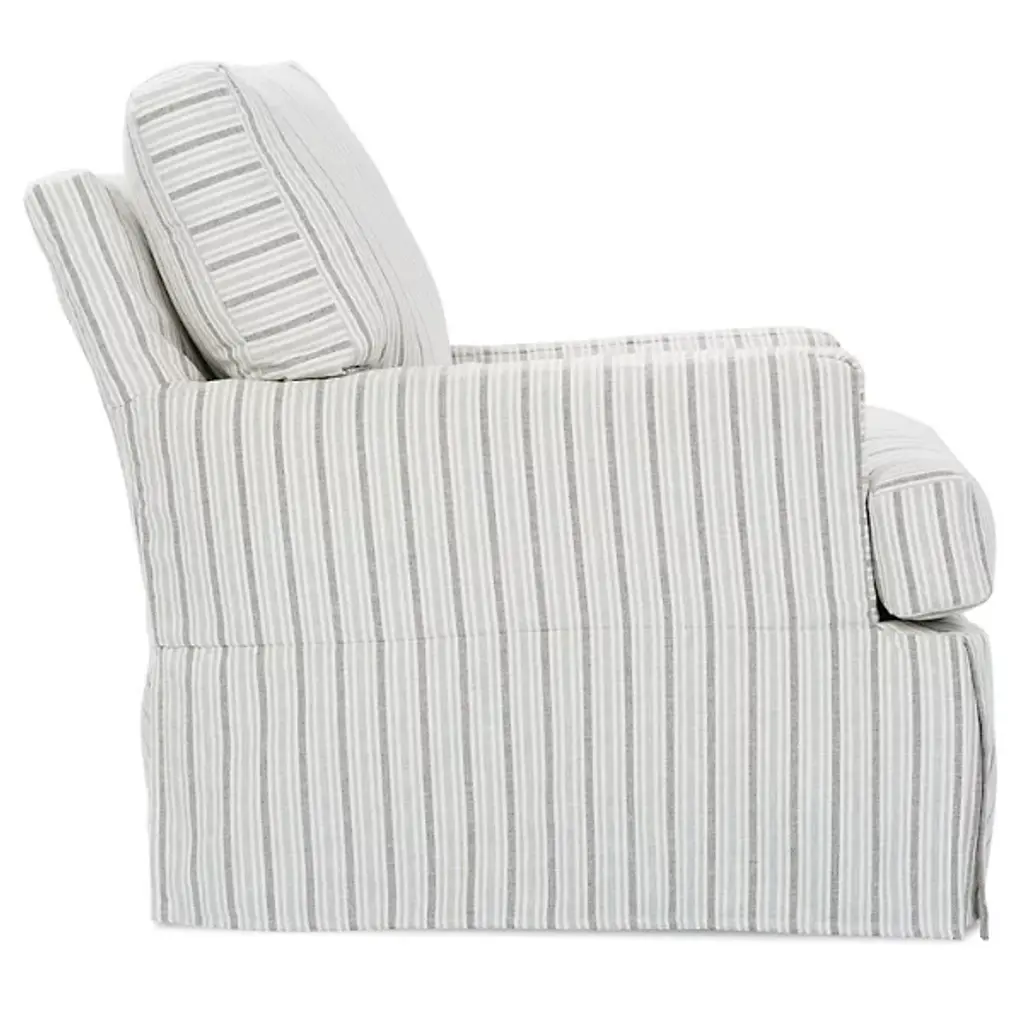 The Sadie Swivel Glider Chair from Rowe Furniture blends comfort and sustainable design. It is meticulously crafted in the USA and combines cotton and polyester fabric upholstery, offering a soft feel. Its transitional style effortlessly complements your setting, adding a touch of sophistication to your home. Delight in unparalleled comfort with the high-resiliency foam-filled cushioning while swivel capability lets you effortlessly position yourself. Built with eco-friendliness in mind, this chair features a partially plant-based core.