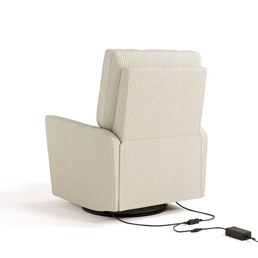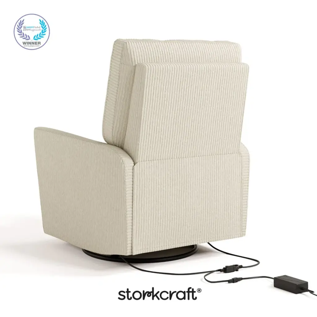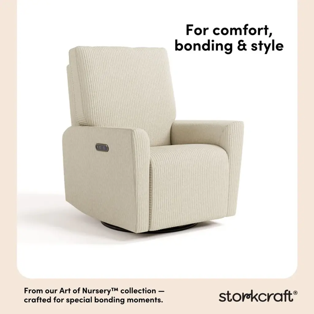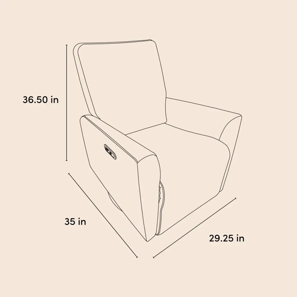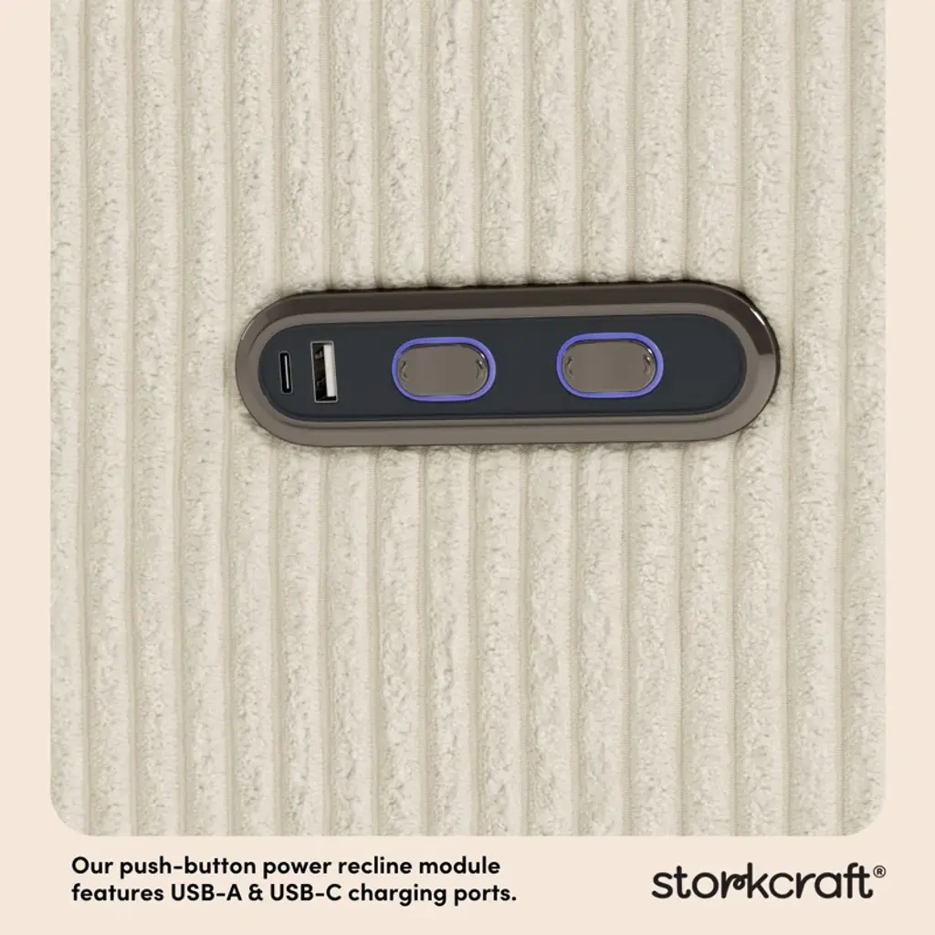 Introducing the elegant and innovative Storkcraft Santorini Deluxe Nursery Power Recliner Swivel Glider — part of Storkcraft’s exclusive, ultra-premium Art of Nursery Collection. The Santorini Deluxe Nursery Power Recliner Swivel Glider embodies the signature, elevated designer details of Storkcraft’s premium Santorini Collection, now reimagined as a comfortable, relaxing nursery glider rocking chair — specifically designed for bonding moments with your newborn. More than just a nursery glider, the innovative Santorini provides effortless comfort with its “push-button” electronic recline feature, allowing you to easily lean back and return upright at the touch of a button. As an extension of the multi-award-winning Storkcraft Santorini Collection, the Santorini Deluxe Nursery Power Recliner Swivel Glider also includes a dual-USB charging port — equipped with both a USB-A and USB-C port to keep your smartphone, tablet, or e-reader charged, so you can focus on your baby. The Santorini is part of the Art of Nursery line of products — hand-sketched, elevated nursery and kids' bedroom pieces designed with love and inspired by the beauty and landscapes around us. Quality-crafted with premium materials and appointed with luxurious details, Art of Nursery is an exclusive Storkcraft collection, designed in-house, that personifies elegance, imagination, and craftsmanship. These grow-with-me pieces are brought to life — with love — by real parents for real families, and are smartly engineered to adapt to your growing baby throughout childhood’s ever-changing stages. An original Storkcraft design, the Santorini is exclusively manufactured by Storkcraft, North America’s longest-standing name in cribs since 1945. Backed by Storkcraft’s one-year limited manufacturer’s warranty and a supportive, real-life Customer Care team, the Santorini is built to provide both quality and peace of mind. Easy assembly is required, and a power source (wall outlet) is needed. This exclusive, in-house Storkcraft original design is part of Storkcraft's flagship Art of Nursery Collection.