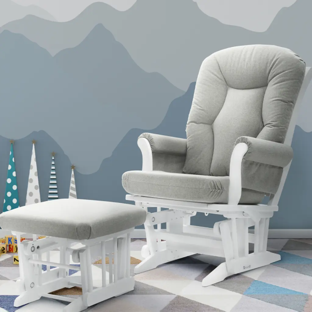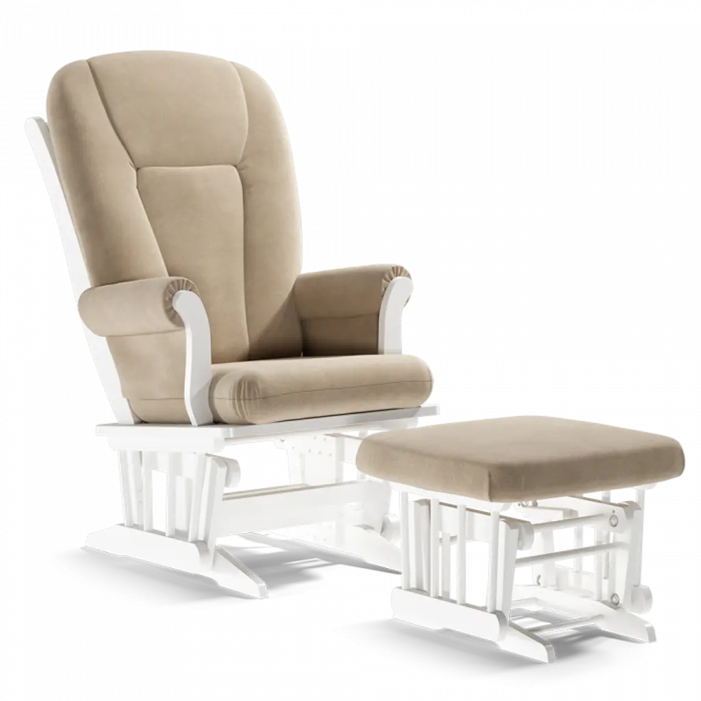 The Exclusive Victoria Glider Multiposition Lock and Recline with ottoman combo stands out with a design inspired by the curves and details of a contemporary sledge.