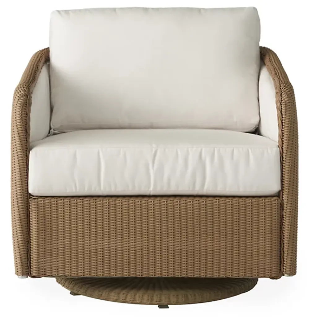The Visions Swivel Glider Outdoor Lounge Chair from Lloyd Flanders adds casual comfort to outside spaces with classic wicker styling reinterpreted using strong, modern materials. It is made in the USA and features a circular base wrapped in weather-resistant Lloyd Loom Wicker, allowing smooth swiveling. The welded aluminum frame features a robust finish offering strength against the elements, while the wicker weave itself, woven from aluminum wire and cellulose fibers, adds a resilient rustic texture. A wraparound back and plush cushions on the seat and sides offer inviting comfort, offering relaxed, all-weather luxury to gathering spaces or quiet retreats.
