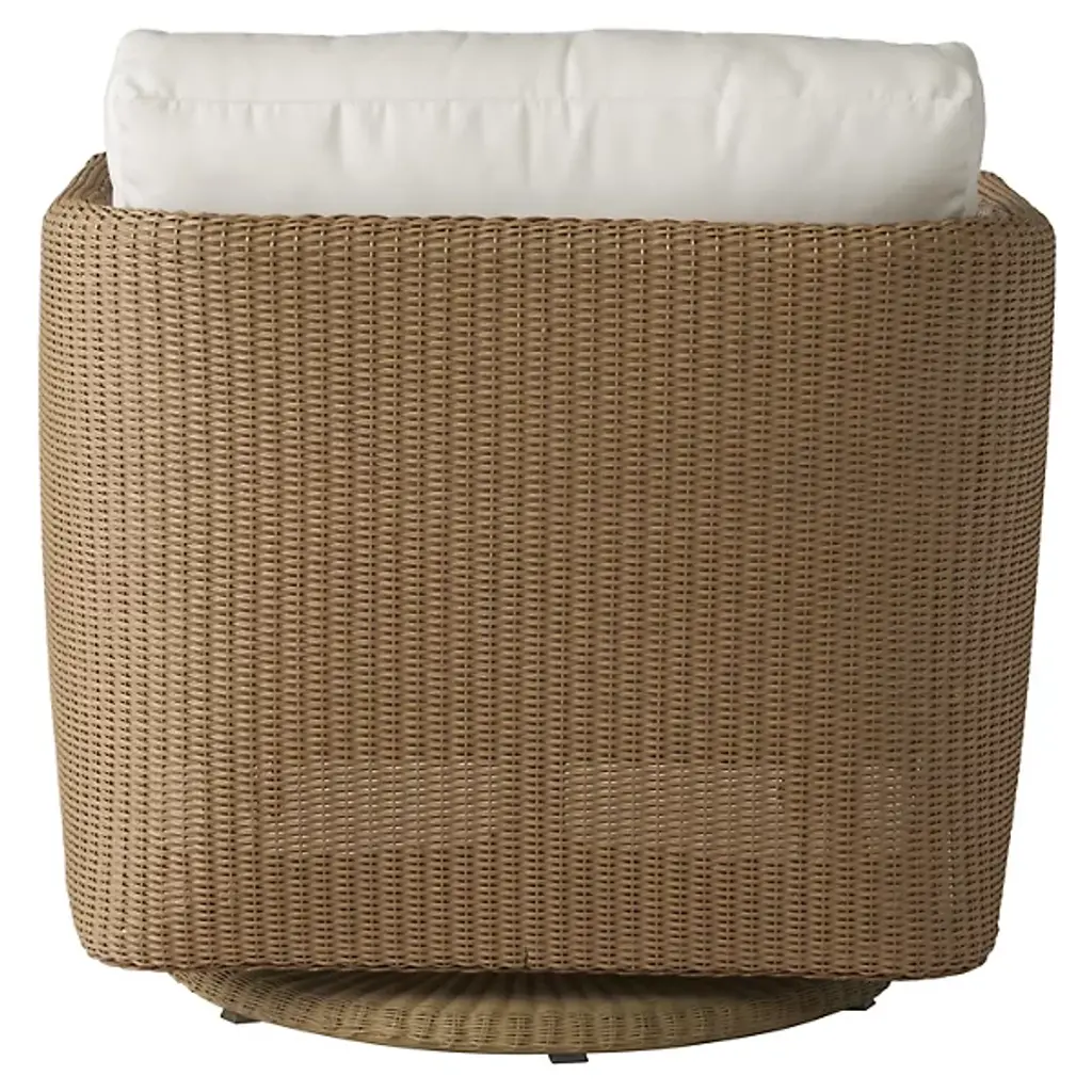 The Visions Swivel Glider Outdoor Lounge Chair from Lloyd Flanders adds casual comfort to outside spaces with classic wicker styling reinterpreted using strong, modern materials. It is made in the USA and features a circular base wrapped in weather-resistant Lloyd Loom Wicker, allowing smooth swiveling. The welded aluminum frame features a robust finish offering strength against the elements, while the wicker weave itself, woven from aluminum wire and cellulose fibers, adds a resilient rustic texture. A wraparound back and plush cushions on the seat and sides offer inviting comfort, offering relaxed, all-weather luxury to gathering spaces or quiet retreats.