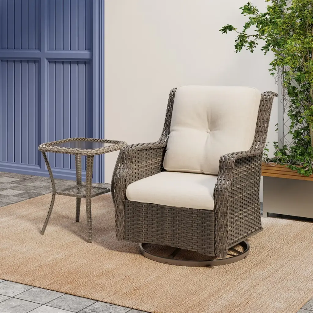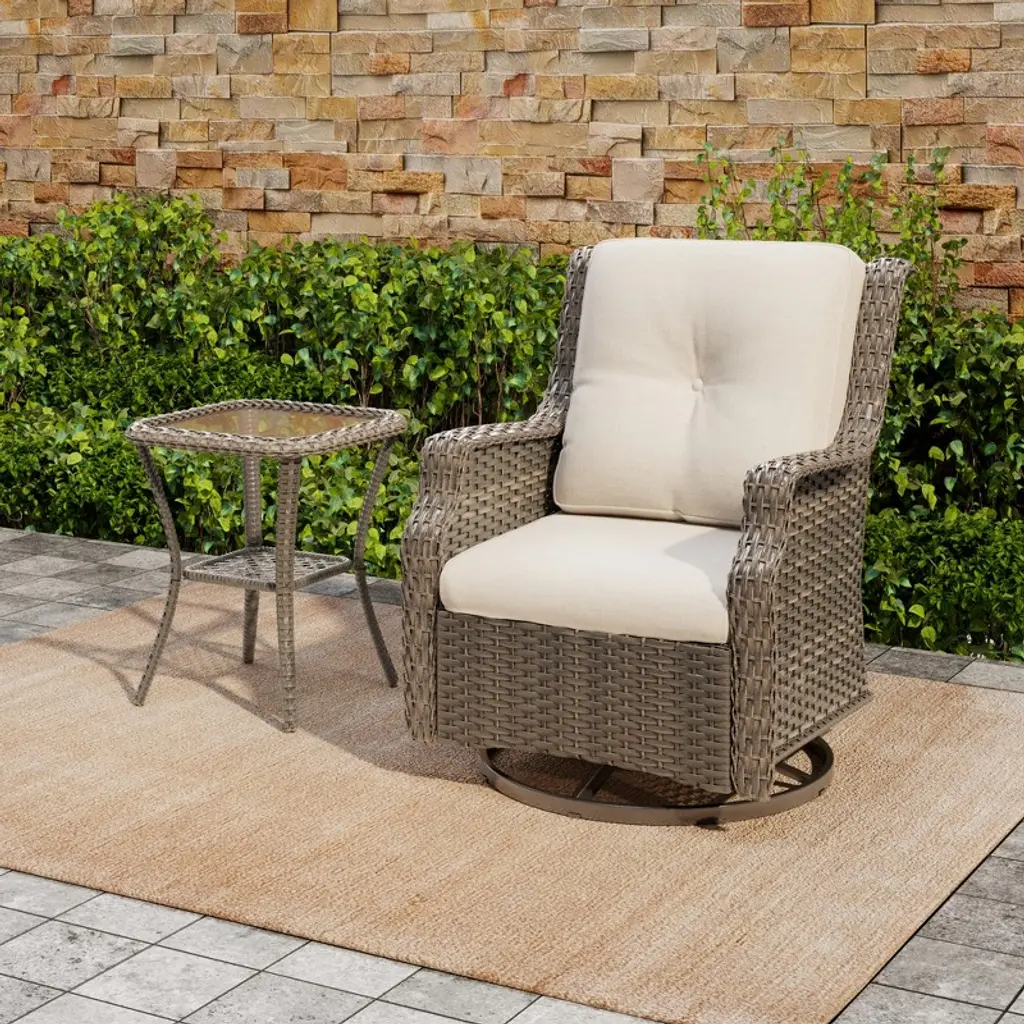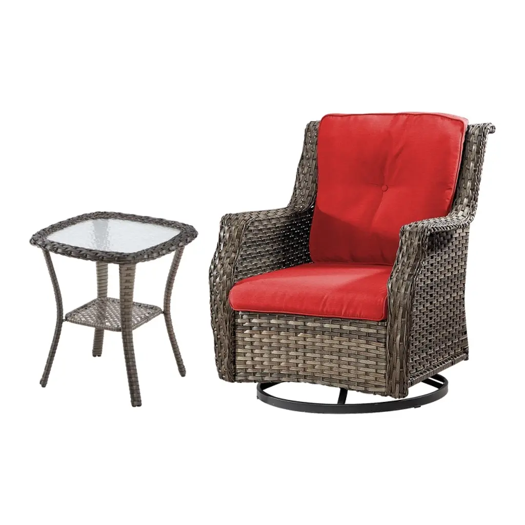 Relax in comfort and style with this 2-piece outdoor wicker swivel glider chair set. Featuring a handwoven all-weather rattan frame and thick red cushions, this set brings a pop of color and modern charm to your patio, garden, or balcony. The swivel glider chair offers a smooth 360¡ã rotation and gentle rocking motion, making it perfect for reading, chatting, or simply enjoying the fresh air. The matching side table with a tempered glass top provides the ideal spot for your coffee, snacks, or decor. Built to last with a rust-resistant steel frame and fade-resistant fabric, this set combines durability and comfort for year-round outdoor enjoyment.