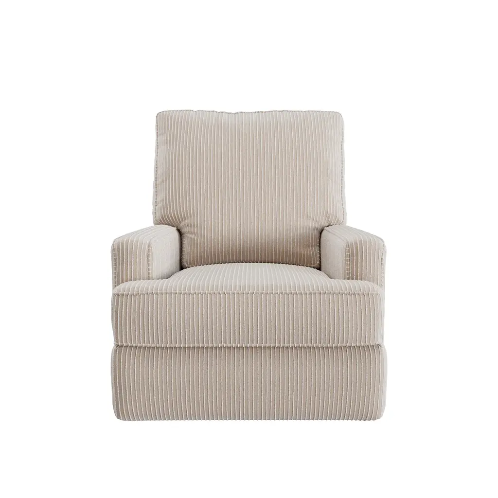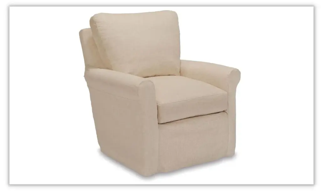 The neat and sophisticated styling of the You Design Ball Arm Swivel Glider elevates the appeal of your living room interiors. It features a cushioned seat, T-backrest, and rolled arms, attached to a swivel base. The ideal spot to sip your morning coffee or spend a lazy afternoon, this traditional-style home furniture is a great functional addition to your living room. Custom-order fabrics are available.