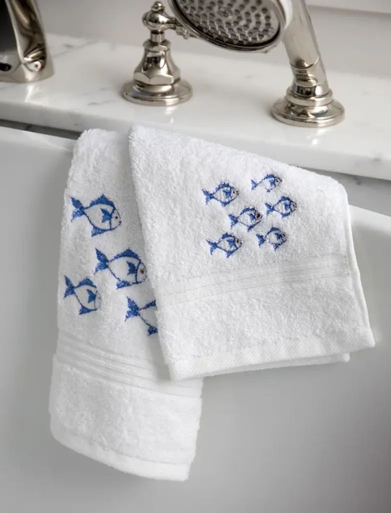 These coastal School of Fish guest towels are not only functional but also stylish, making them a perfect addition to any beach house, coastal-themed home, or anyone who loves the ocean. Order now and add a touch of seaside elegance to your home. Size: 12” x 19” Fabric: White Terry Toweling Embroidery: School of Fish (Blue) Washing: Machine washable cold, tumble dry low or line dry