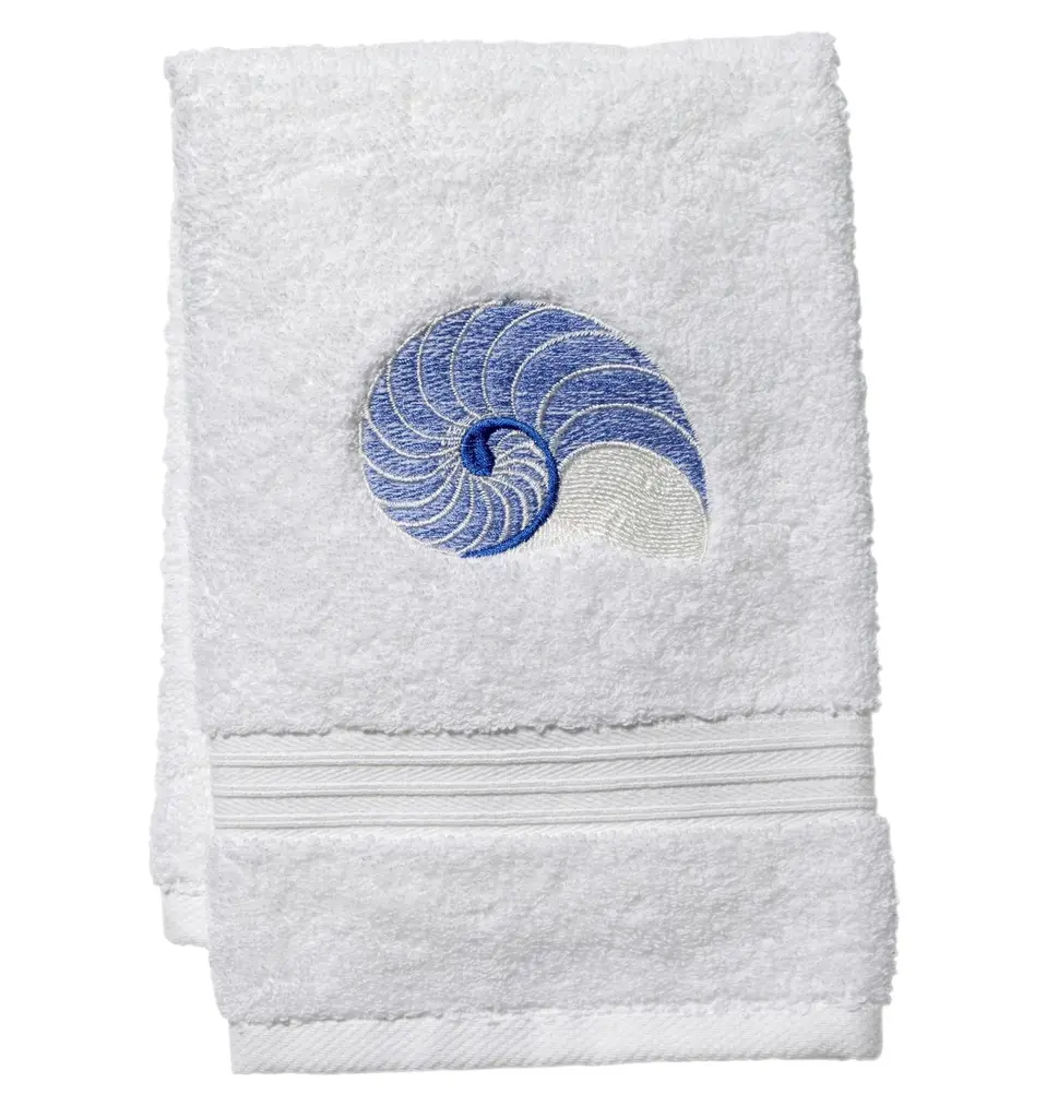 Our signature best selling item! These Guest Towels make perfect hostess gifts, add elegant accents to any bathroom, are absorbent, durable and easy care. Customers buy for themselves, their friends and the office ... again and again. Size: 12” x 19” Fabric: White Cotton Terry Embroidery: Blue Striped Nautilus Washing: Machine washable cold, tumble dry low or line dry Made by a group of Zulu women in Kwa-Zulu Natal, South Africa.