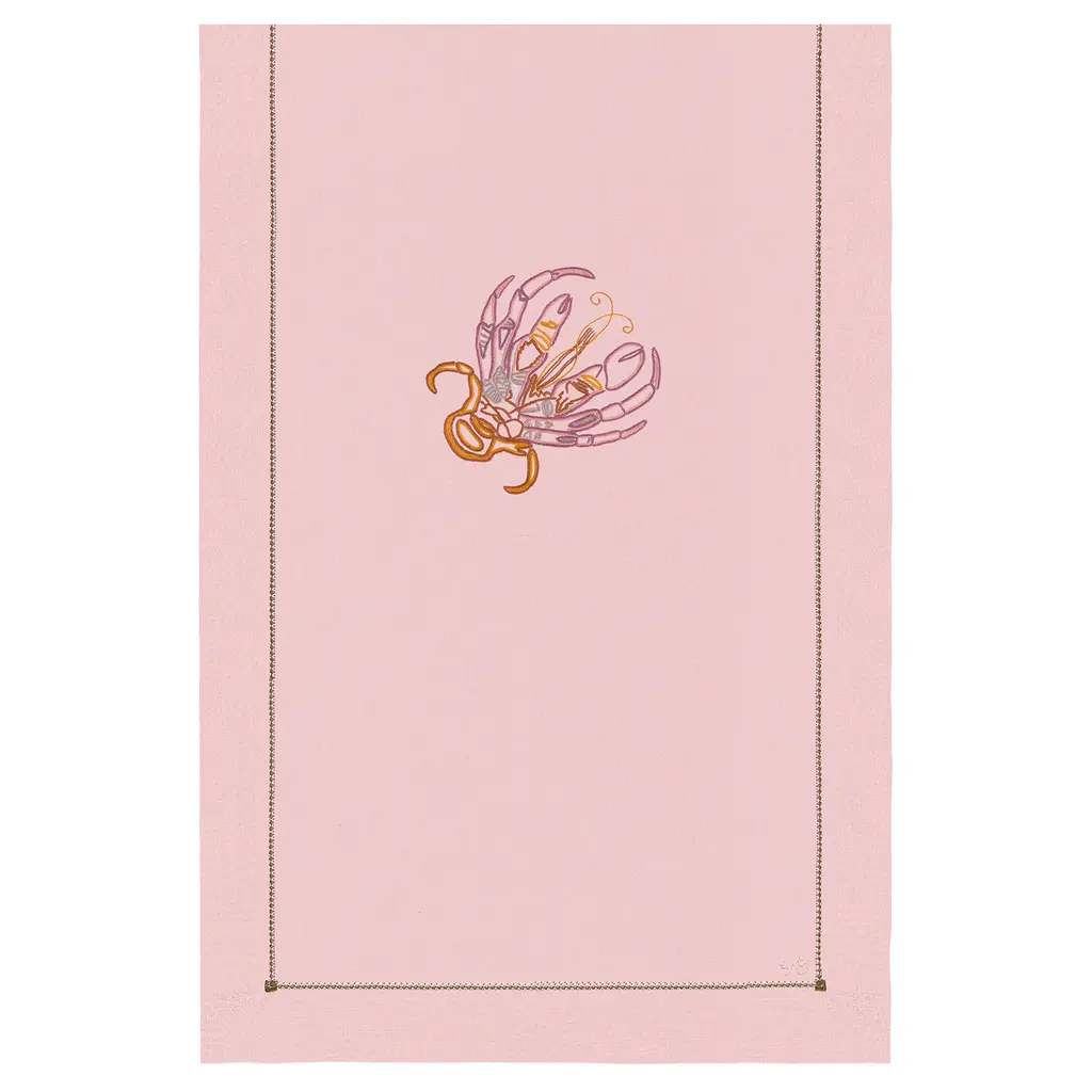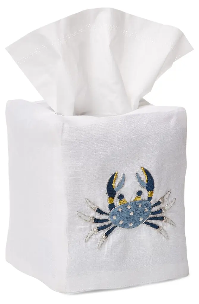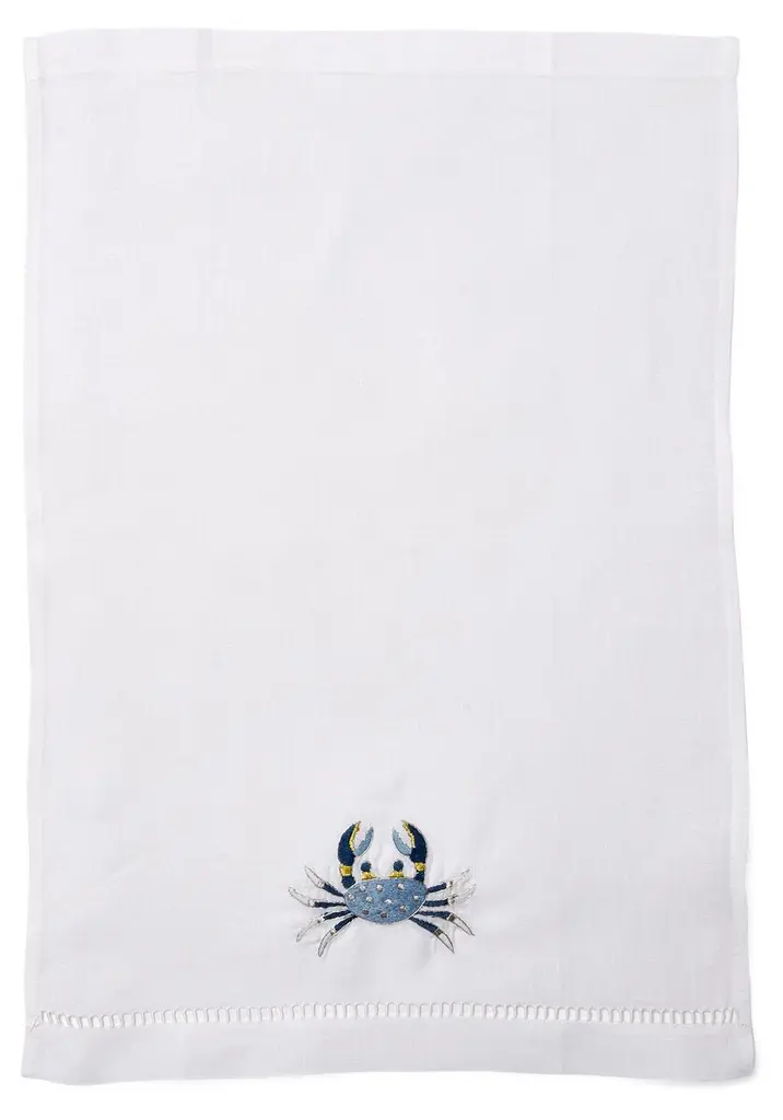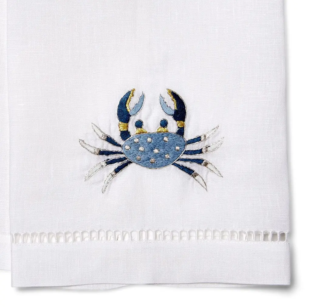 Exclusive to One Kings Lane: This exquisite guest towel is made from crisp white linen and hand-embroidered with a charming blue crab design.