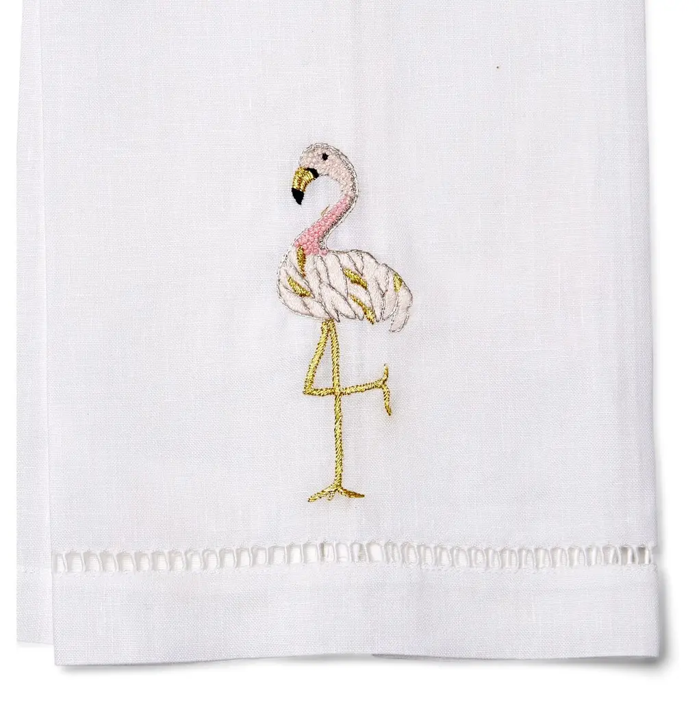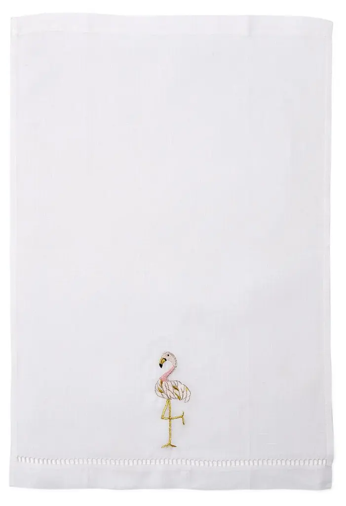 Exclusive to One Kings Lane: This exquisite guest towel is made from crisp white linen and hand-embroidered with a charming flamingo design.