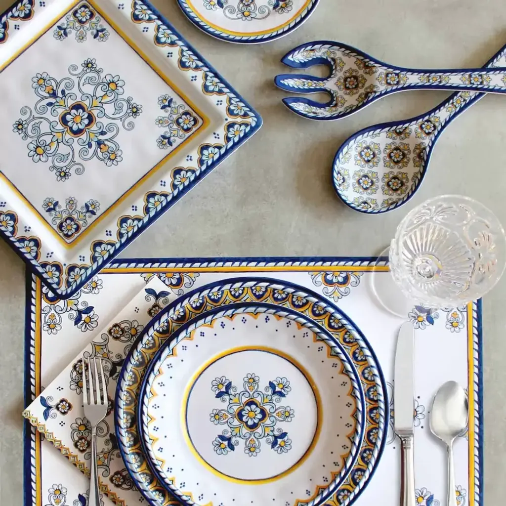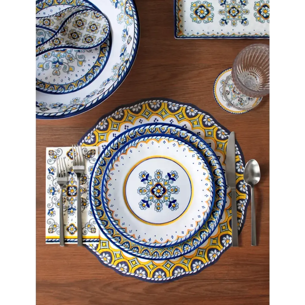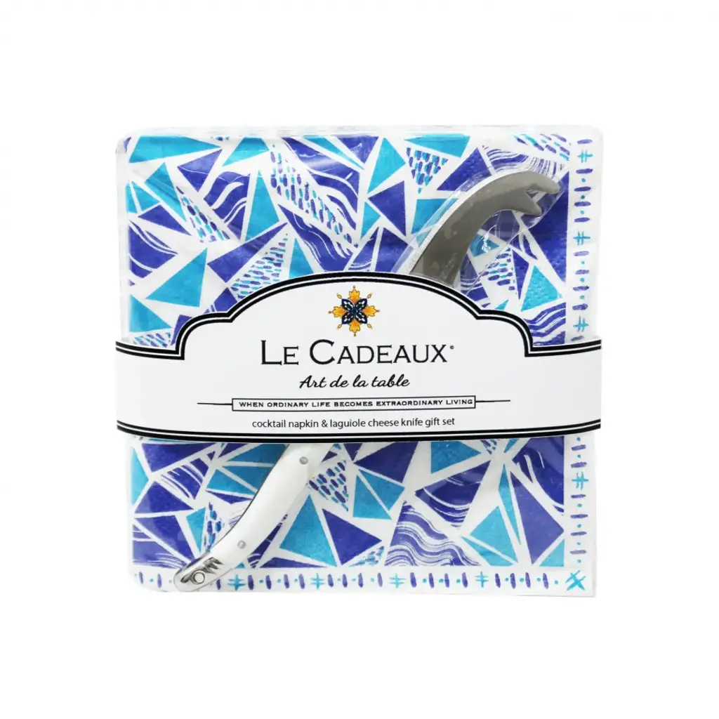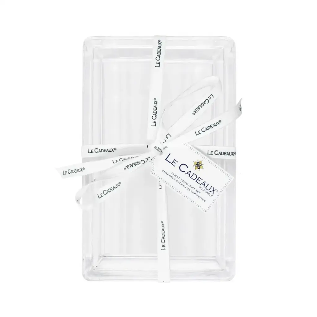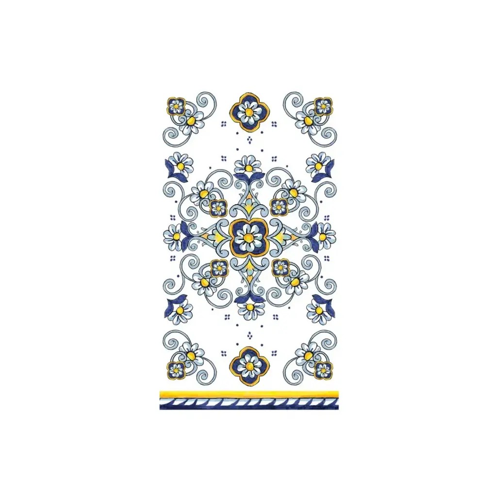 This chic gift set with 15 Sorrento guest/buffet napkins in a heavy weight clear acrylic holder is already ribbon tied and tagged to make your gift giving effortless! Sorrento guest/buffet napkins with their unique European inspired design and rich color palette of deep blues and golden yellows will pair beautifully with our Sorrento dinnerware and gift sets collections or make a perfect stand alone choice for any occasion. Our soft touch napkins are made of the finest quality 100% wooden pulp virgin tissue. Product includes 1 x pack of 15 Guest Towel/Buffet Napkins with dimensions 4.25" x 7.75" - 12.75” by 15.75” when opened and 1 x acrylic holder with dimensions 5.5” wide by 2” tall.