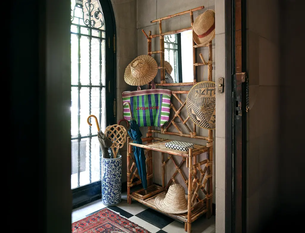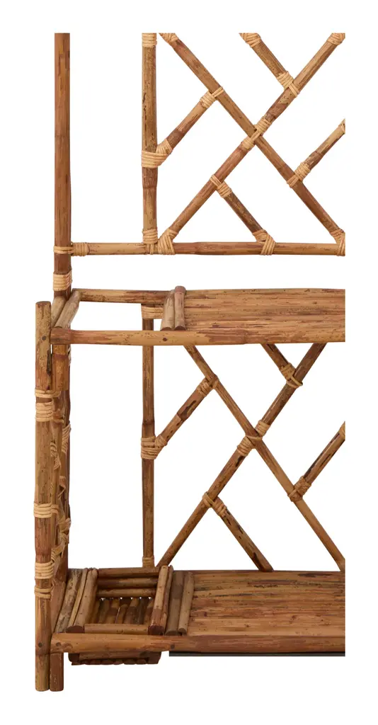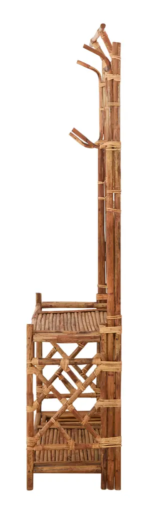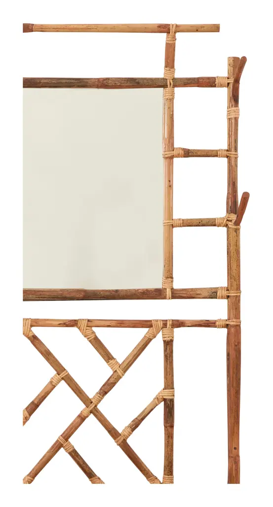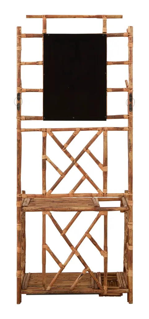 Bring order to your entryway with the help of our antique inspired Dorset Hall Tree. Crafted from natural, eco-friendly bamboo in the style of late 18th-century Chinese Chippendale designs, this practical piece features four hooks for hanging jackets, hats and totes; a spacious opening for corralling umbrellas and walking sticks; two shelves with plenty of room for styling storage vessels and decorative objects; and a simple rectangular mirror for those final touch-ups before you leave the house. An effortless addition to any home, Dorset is a great way to add layers of texture and travel to a foyer or mudroom. •bamboo•each is unique; rustic charm and natural characteristics should be expected •india Dimensions •approximately 28"W x 14"D x 71"H•shelves: approximately 16.5"W x 13"D•mirror: 14"W x 19"H