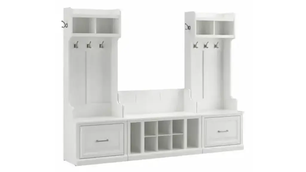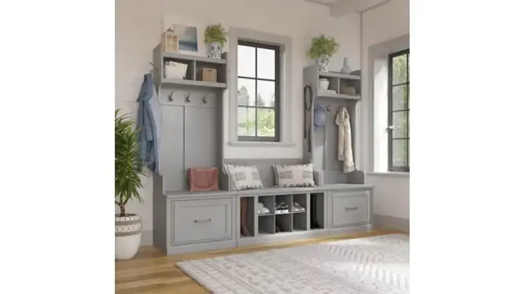 The Bush Furniture Woodland Entryway Storage Set with Hall Trees and Shoe Bench with Drawers combines transitional styling and a practical design to offer an ideal organization solution. Have a seat on the durable storage bench and take a moment to relax as you get ready to head out the door or come home after a long day. Each section of the long mudroom bench supports up to 250 lbs., so you can sit down to put on and take off your shoes or set shopping bags down after a trip to the store with confidence. Vertical and cube shelving along with two small drawers to the left and right accommodate footwear and accessories for a clutter-free entryway, mudroom or foyer. The narrow hall trees each include three Weathered Nickel coat hooks in the front and one on each side for hanging jackets, hats, scarves and more. Smaller items like gloves and keys can be stashed neatly inside four open compartments, and the top shelves provide an area to brighten up your entryway with decorations. The hall tree bench's transitional design blends elements of contemporary and traditional styling to complement a wide range of home furnishings while your choice of finish options make it easy to find the perfect look for your space. This entryway bench and coat rack set has been tested to meet Bush Furniture's standards for safety, performance and durability. Overall Dimensions: 89"W x 17.44"D x 68.98"H. Hall Tree with Shoe Bench with Drawers (2): 24.49"W x 17.44"D x 68.98"H. Shoe Storage Bench with Cubbies: 39.72"W x 17.44"D x 32.44"H. Ships ready for easy assembly.