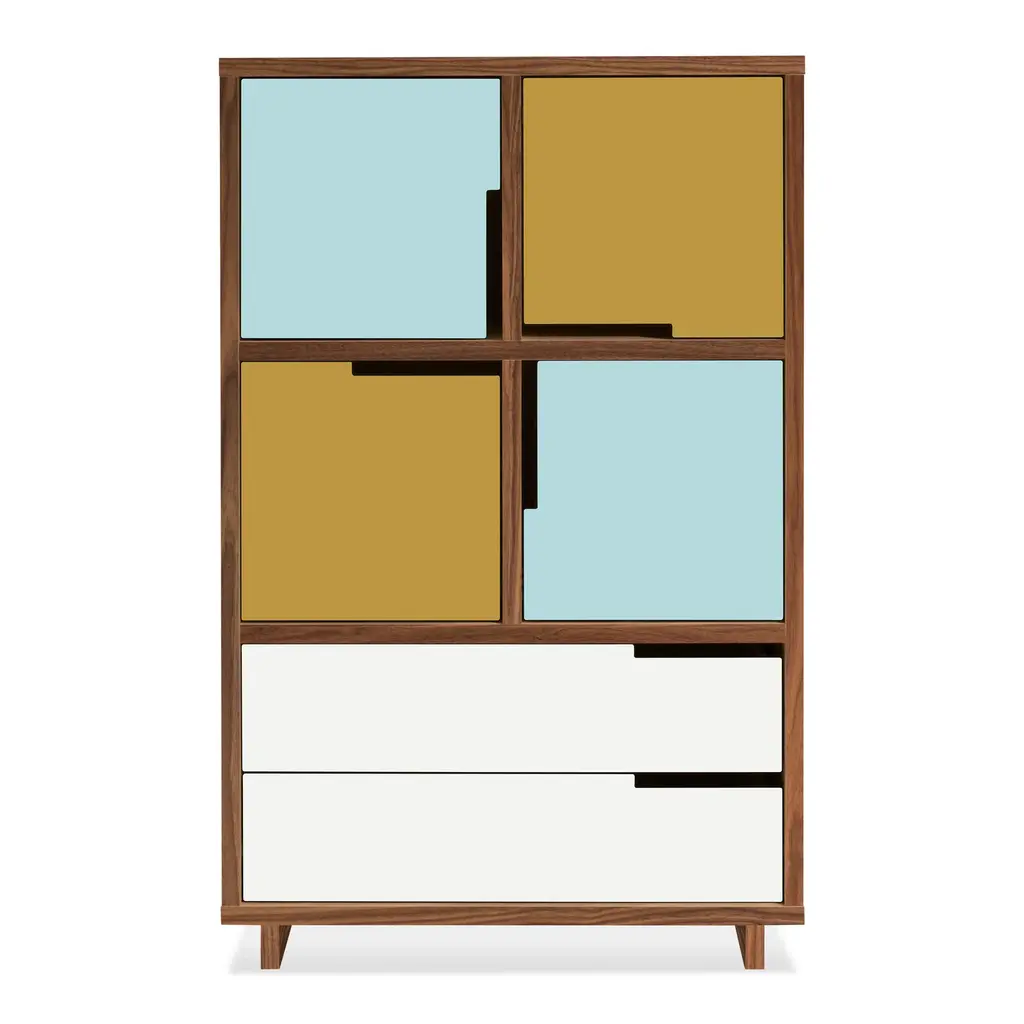 A piece of great visual effect, this coat rack unit features a geometric wooden frame decorated with colorful plastic laminate panels that will enliven any contemporary entryway, both commercial and residential. Crafted of wood, the unit is raised on a red base with rounded corners and features a red rectangular panel with seven yellow round knobs, and a tall lateral storage unit with a black side door and front panels in light blue and turquoise with a yellow central stripe. Highly decorative and functional, this 2018 design by George Sowden is a limited edition series of 25 pieces.