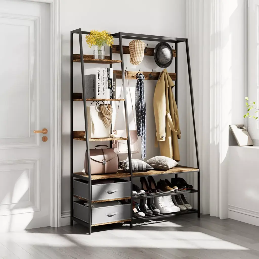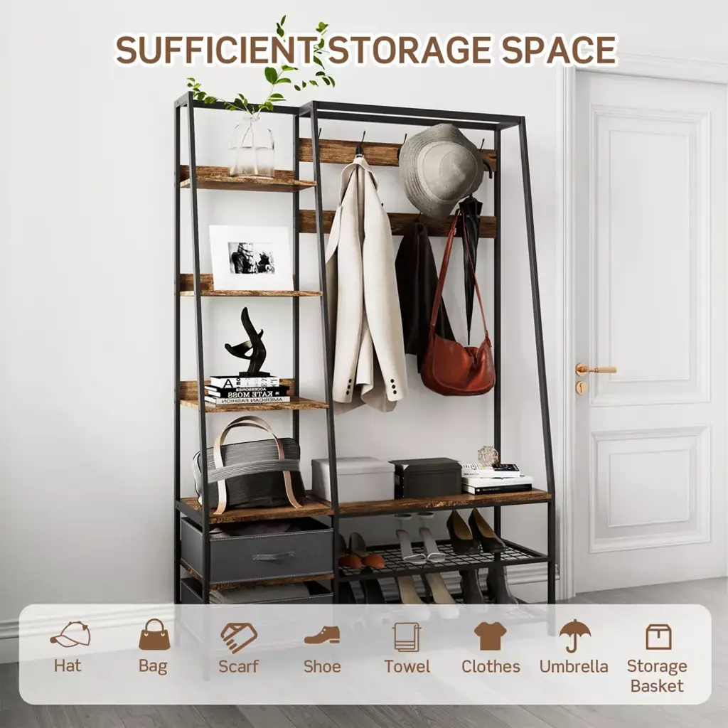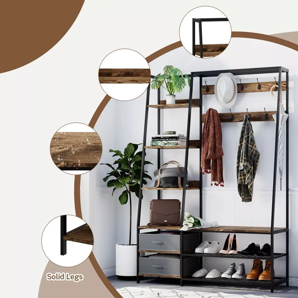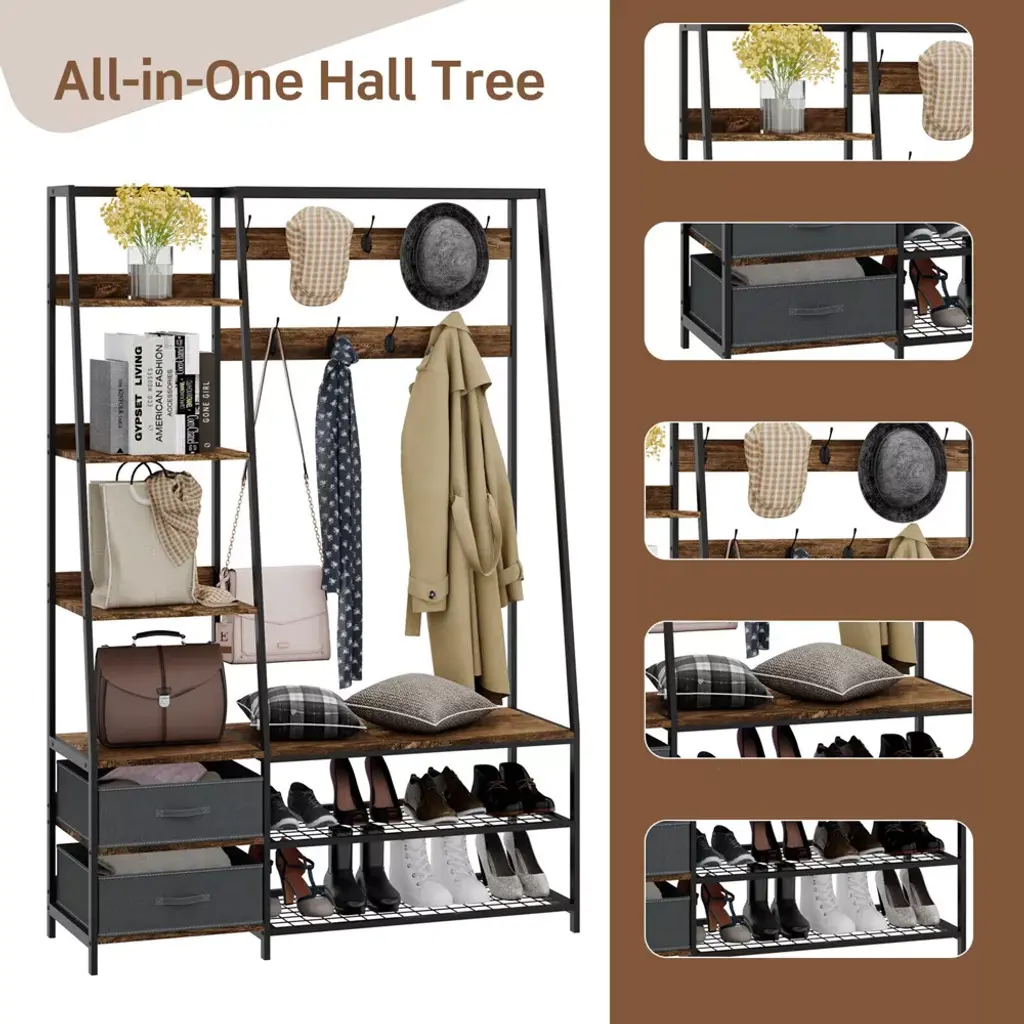 Are you looking for a versatile coat rack to well organize your stuff? Our multifunctional hall tree will be a perfect storage solution. It has 9 dual hooks,6-tier shelves,2 foldable dressers,1 shoe bench and 2-tier shoe rack,allowing you to hang or place your hats,bags,clothes,shoes and more. Besides,you can sit on the bench to conveniently change shoes or use it as an ordinary storage shelf. If you need more space to display your ornaments,you can easily remove the fabric dressers. Also,our coat rack is made of solid steel and engineered wood materials,which is strong and long-lasting enough to serve you and your family for a long time.FeaturesVersatile hall tree with 9 dual hooks,6-tier shelves,2 foldable storage bins,1 shoe bench and 2-tier shoe rack 2 fabric storage boxes can be removed and folded into compact size 2-tier mesh wire shoe rack with good ventilationSpecifications:Color: Rustic Brown Material: Engineered Wood,Steel Overall Dimension: 48" x 16" x 71" (W x D x H) Inner Size of Each Drawer: 18" x 13.5" x 5.5" (L x W x H) Weight Capacity of Each Hook: 15 lbs Weight Capacity of Each Shelf(Left): 44 lbs Weight Capacity of Shoe Bench: 220 lbs Weight Capacity of Each Shoe Rack: 44 lbs Weight Capacity of Hanging Rod:110 lbs Net Weight: 63 lbs Package includes: 1 x Hall Tree 1 x Instruction