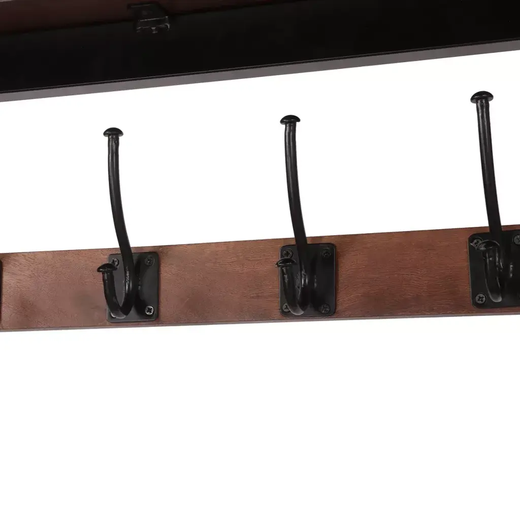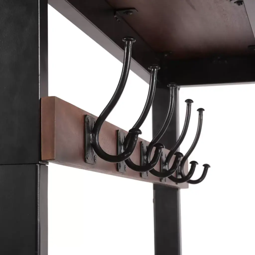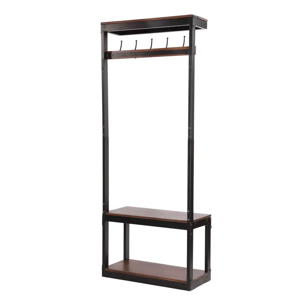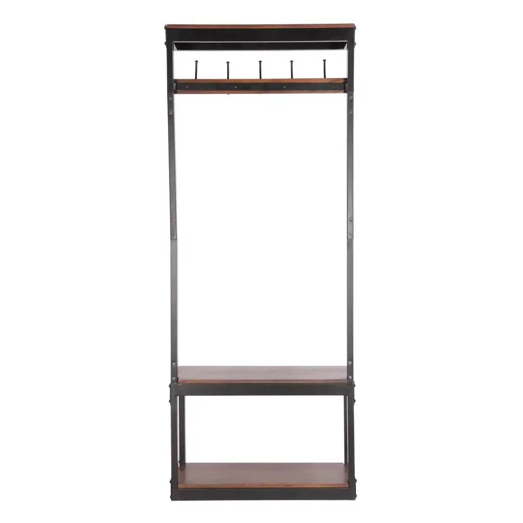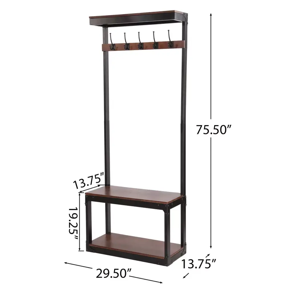 Greet your guests with a welcoming atmosphere by eliminating the mess in your home with an extraordinary accessory. With five double hooks to hang your guest coats, hats, and other items, our handcrafted coat rack bench is a multi-functional addition that is designed to help you organize your clutter. This is finished with a handsome bench that also acts as storage for your shoes or bags. Crafted with gorgeous mango wood and a durable iron frame, this coat rack bench is perfect for any foyer or entryway.MODERN INDUSTRIAL: Our coat rack bench incorporates a powder-coated frame with smooth wood to create an understated modern industrial design. Featuring sleek metal contrasted by natural wood, this bench offers a chic aesthetic to any home. HANDCRAFTED DESIGN: This accessory is expertly designed and handcrafted with artisan expertise. Any natural variations are not product flaws, but rather, will ensure that your purchase is truly a one-of-a-kind product.COAT HOOKS AND STORAGE: Featuring five double hooks, this coat rack bench is able to hold your coats, hats, scarves, towels, and other items. Finished with a convenient bench and space to store your shoes, this accessory is a perfect addition to your entryway.MANGO WOOD: Mango wood features gorgeous golden browns with natural hues that come from spalting, making each piece a one-of-a-kind color. Not only does this hardwood showcase unique patterns and take well to stains, but it also offers dense durability to resist wear and tear.DIMENSIONS: Choose an accessory that is the perfect size for you and your furniture. This coat rack bench is 29.50” W x 14.00” D x 75.0” H with a bench height of 19.25 inches. You will love how much your space can transform with the simple addition of this charming coat rack.
