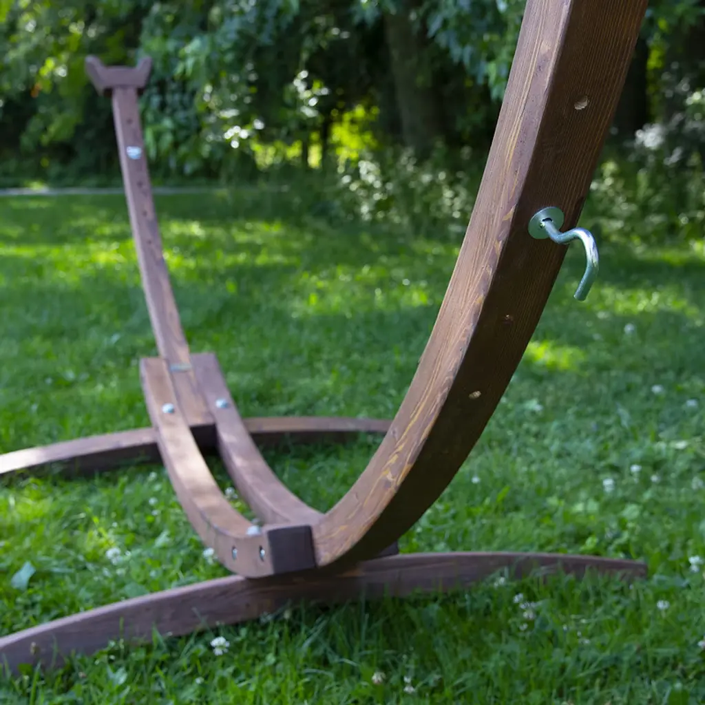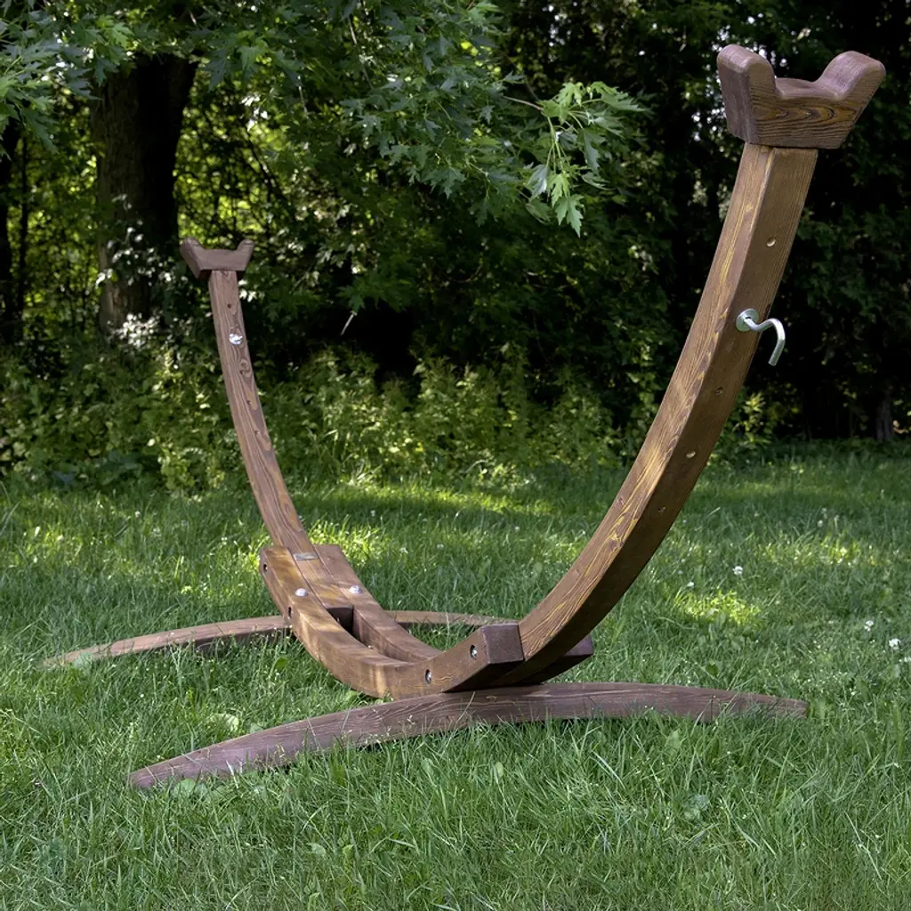 The 10ft Solid Pine Arc Stand is a perfect fit for Vivere's large Authentic Brazillian Cotton Hammocks. Made with solid pine, its rounded square construction makes a design statement that fits with a rugged aesthetic but also complements a perfectly manicured space. This stand provides the desired stability needed for Vivere's double hammocks, rating up to 450s. The laminated surfaces are finished with a high performance natural wood oil sourced in Europe to protect and maintain this stand.