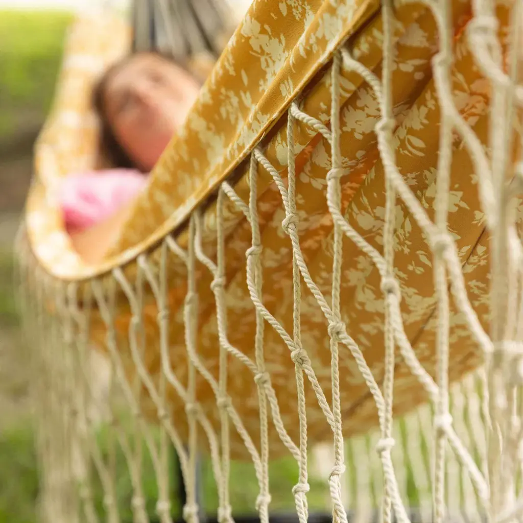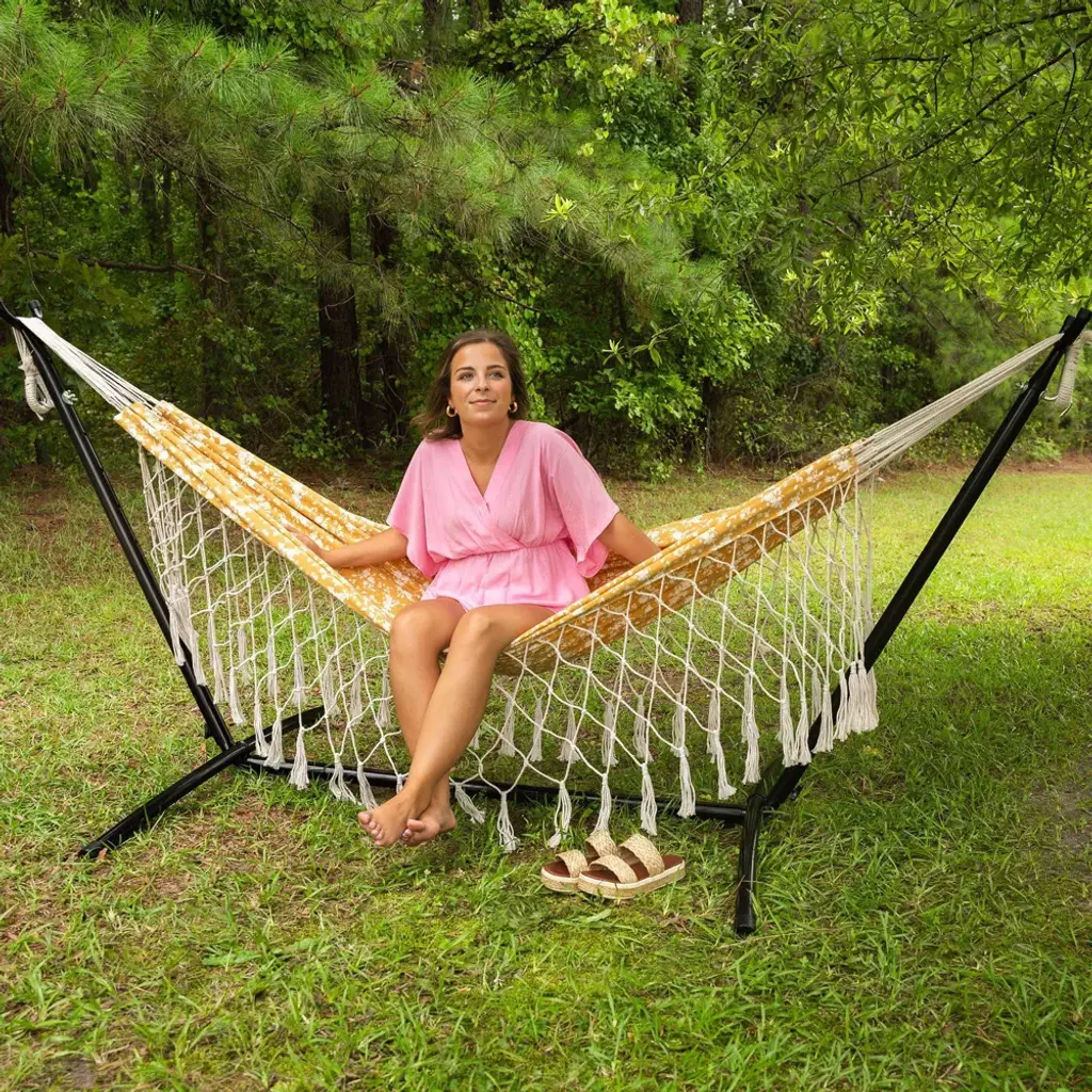 Kick back and relax in the sun or shade with this 10-Foot Bryant T-Spun Fringe Outdoor Fabric Hammock from Threshold™. Made with weather-resistant T-spun fabric in dark yellow for lasting use, this super-comfy hammock is accented with fringe tassels for extra decorative flair. The bed measures 78 inches long and 52 inches wide to give you plenty of space to stretch out, and it's easy to set up with hanging hardware and a hanging stand (not included).Threshold™: Looks like home, feels like you.