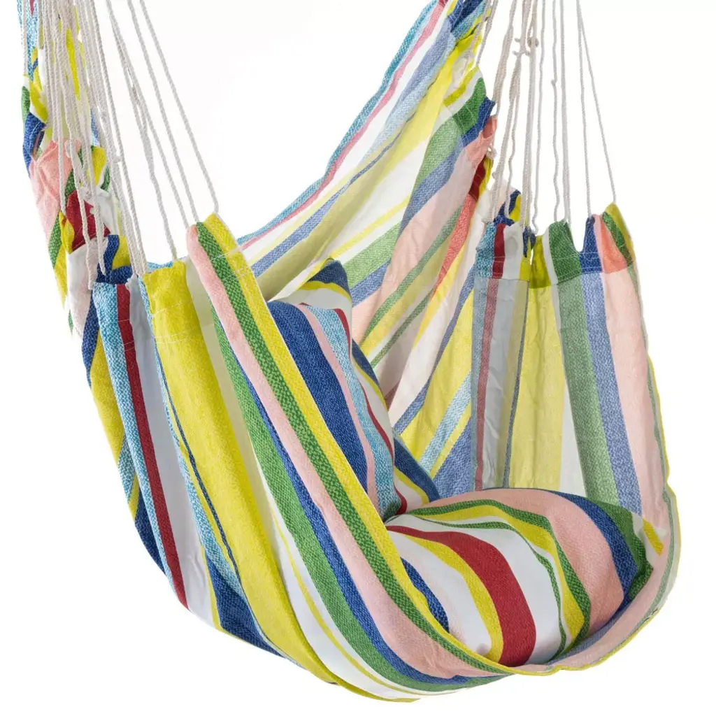 Upgrade your outdoor living with this Cushioned Outdoor Hammock Chair with Spreader Bar Summer Stripe from Threshold™. This hanging hammock chair is a beautiful addition to your patio, backyard or garden. It showcases a multicolored striped design for a fun, on-trend look. The seat cushions offers ultimate lounging comfort, while the wooden spreader bar adds natural style and extra strength. Easily hang the rope from any tree branch, stand or ceiling hook to easily swing in relaxation and comfort (stand not included). Threshold™: Looks like home, feels like you.