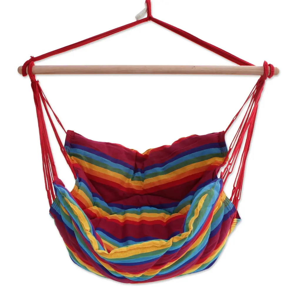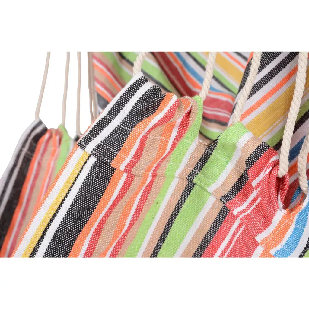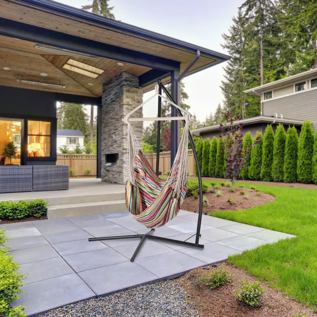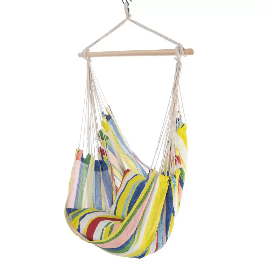 Swing and lounge the day away in this free-standing hammock chair. Made from polyester-blended fabric for the ultimate in comfort, durability, and style. The cotton fiber ropes and hardwood frame are designed to withstand the elements, while creating a fun, relaxing environment for any indoor or outdoor space. Pair with our Boho Breeze Swinging Bungalow Chair Frame for a complete set. Includes fabric hanging chair. Stand is not included.