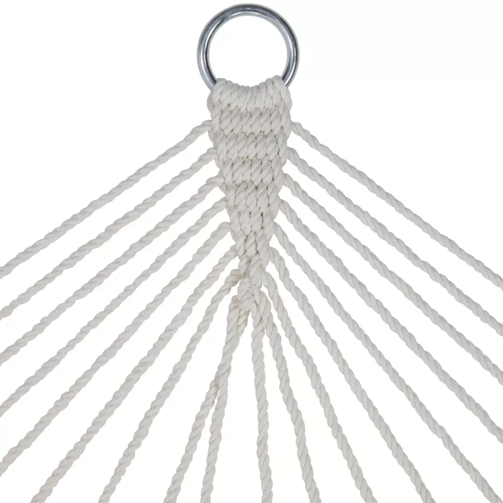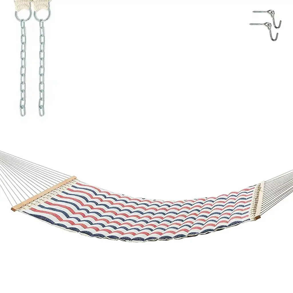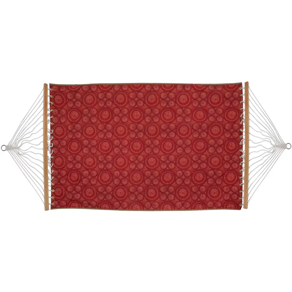 Relax in style with our vibrant 2-point double hammock. A comfy addition to your outdoor space. The woven hammock features a red and white abstract design. Perfect for hanging between trees, on your balcony or in a hammock stand. This hammock is perfect for those hot summer nights or cool autumn days, get yours today to relax longer tomorrow! Product Features: Red and white quilted double hammock Weather reistant finish Hardwood spreader bars Hammock can hold up to 2-people Weight capacity: 300 lbs Outdoor plated o-ring Rope macrame ends Non-tilt sculptured pocket design Made in the USA Hammock features a red bottom Overall dimensions: 132" long x 55" wide Bed: 82" long x 55" wide Material(s): polyester/wood/metal Note: Stand and hanging hardware are not included