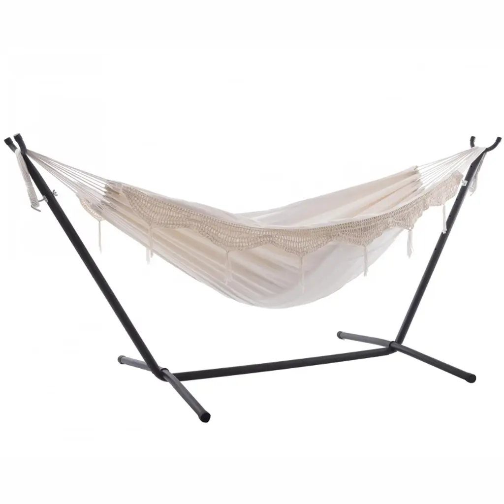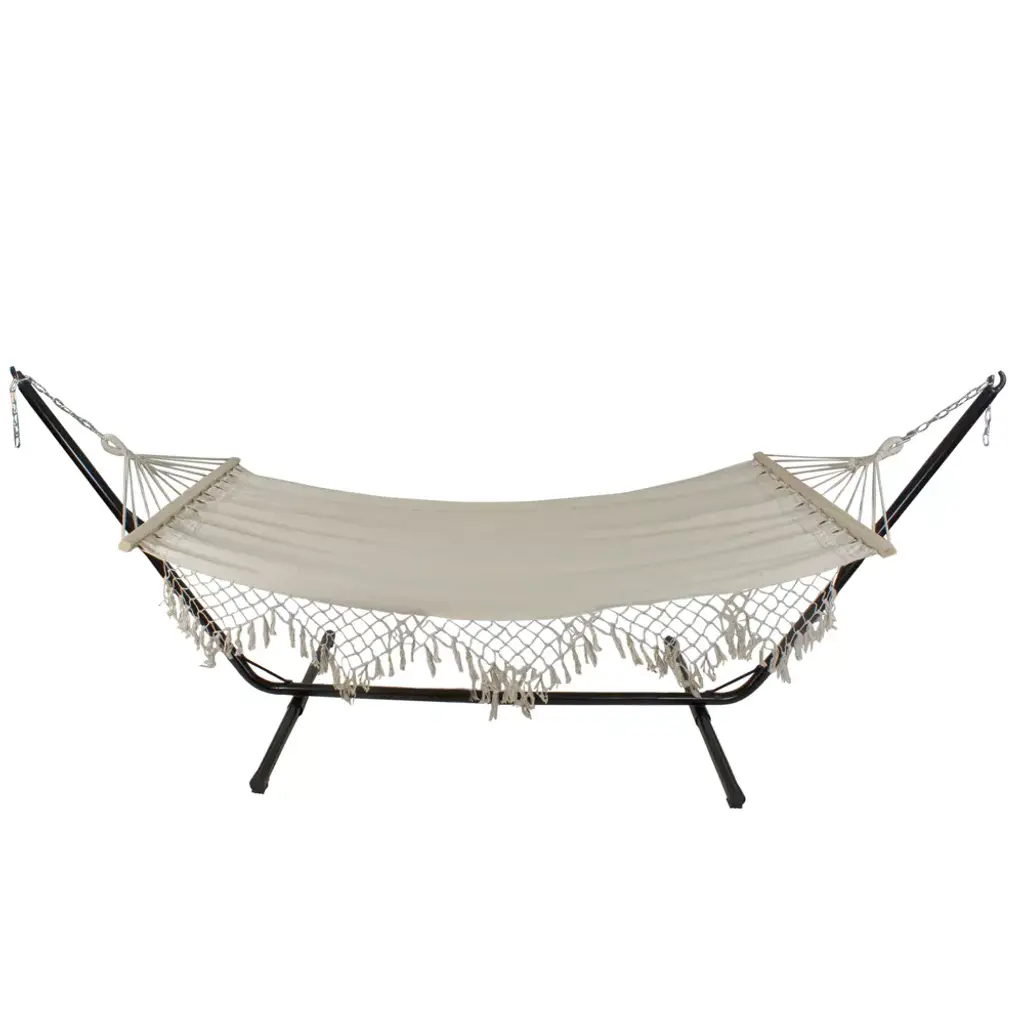 Relax in style with our portable tree hammock. A comfy addition to your outdoor space. Perfect for hanging between trees, on your balcony or in a hammock stand. Product Features Beige colored macrame hammock Comes with tassels on both sides of the hammock Features white rope and wooden bars attached for easy hanging and stability For adults only, children must be supervised Weight capacity: 265lbs Dimensions: 78" long x 47" wide Material(s): poly cotton Note: hammock only - stand and hanging hardware are not included