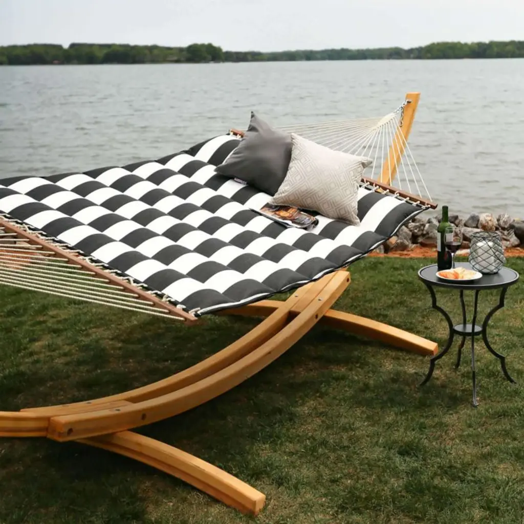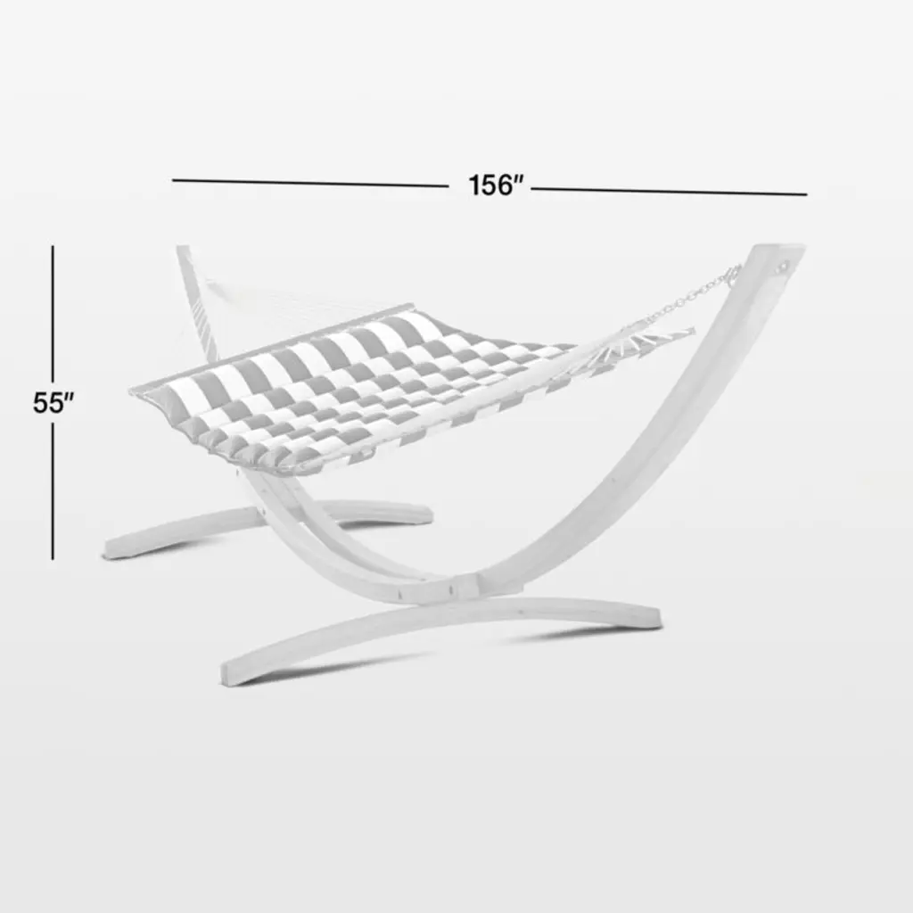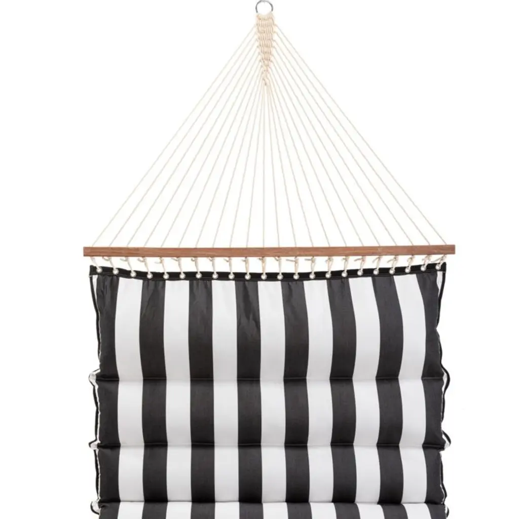 While away summer days in style with our super-comfortable pillowtop hammock. Made with Brazilian teak spreader bars and synthetic rope, the hammock offers a padded, channel-stitched place to unwind with pillowy comfort. Bold black-and-white stripes make a graphic impact in fade- and mildew-resistant Sunbrella fabric. When paired with the coordinating cypress wood stand (sold separately), the hammock makes a modern statement on an old-fashioned backyard staple.