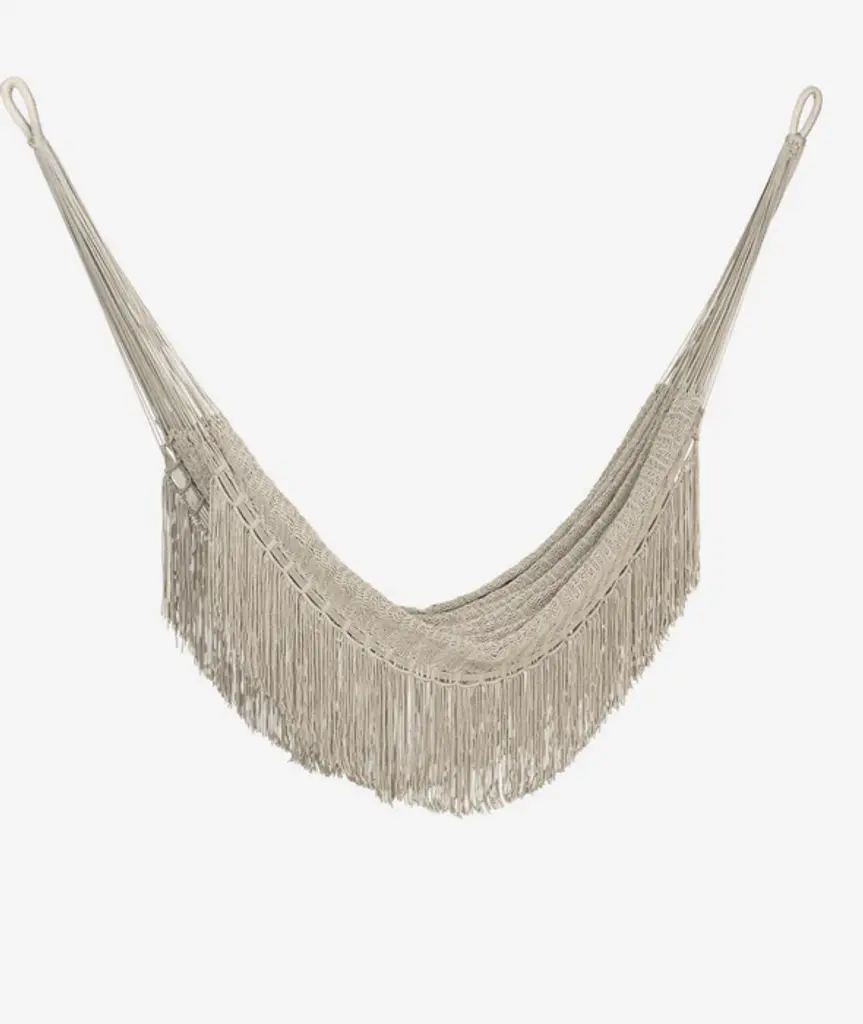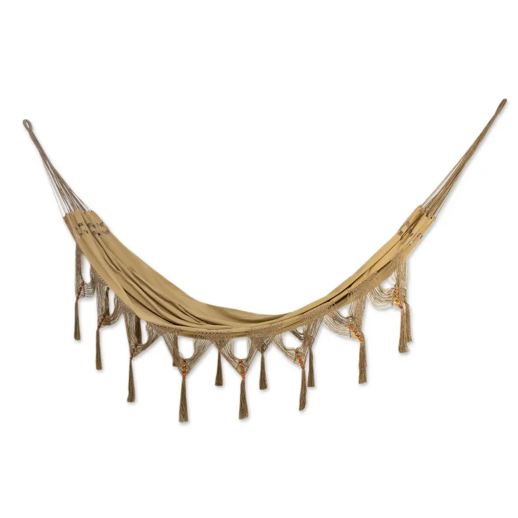 This Double Deluxe Brazilian Style Hammock has understated elegance. This hammock is complimented by a detailed hand crocheted fringe down each side that would make anyone feel like royalty. An excellent addition to any backyard, cabin or campsite.