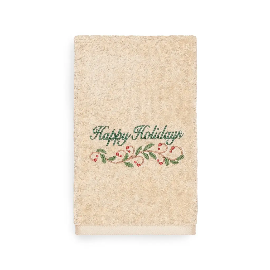 Brighten up the look of your seasonal decor with the 2-Pack of Holly Border Christmas Hand Towels from Threshold™. This pack of two hand towels features a holly border pattern depicting green leaves and poinsettia detailing, making them a beautiful addition to your Christmas decor. Made of midweight cotton-polyester blend fabric, this cream towel pack comes with a loop for easy hanging in the kitchen or bath space. Plus, the pieces are machine washable for easy upkeep. Threshold™: Looks like home, feels like you.