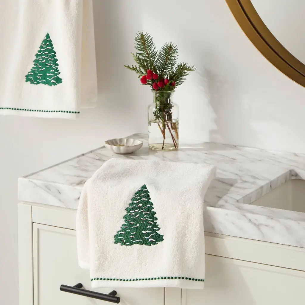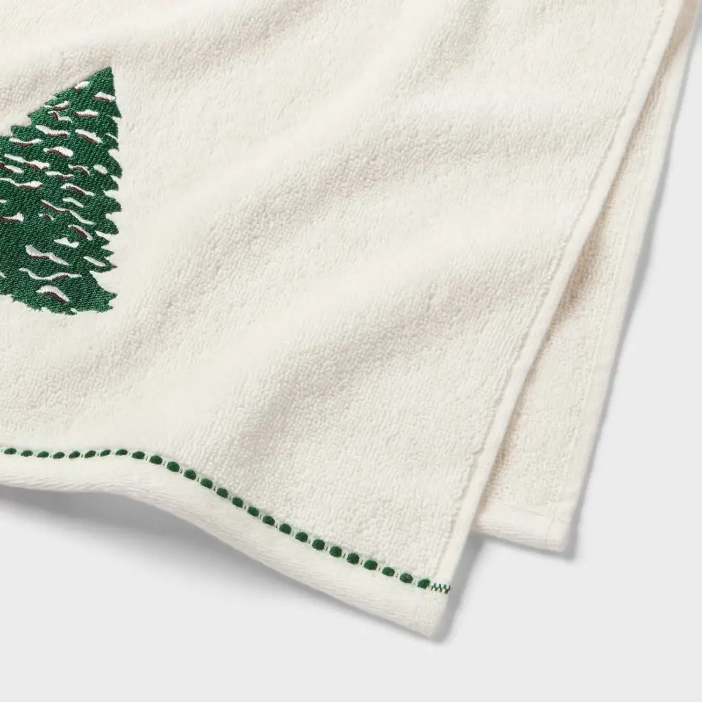 Keep your home ready for Christmas celebrations with the 2-Pack Tree Christmas Hand Towels from Threshold™. The two cream-colored hand towels in this pack feature green tree detailing and border, making them a perfect complement to your seasonal decor. Made of midweight cotton-polyester blend fabric, the towels also include a hanging loop for easy display in the kitchen or bath space. Plus, the pieces are machine washable for easy maintenance.Threshold™: Looks like home, feels like you.