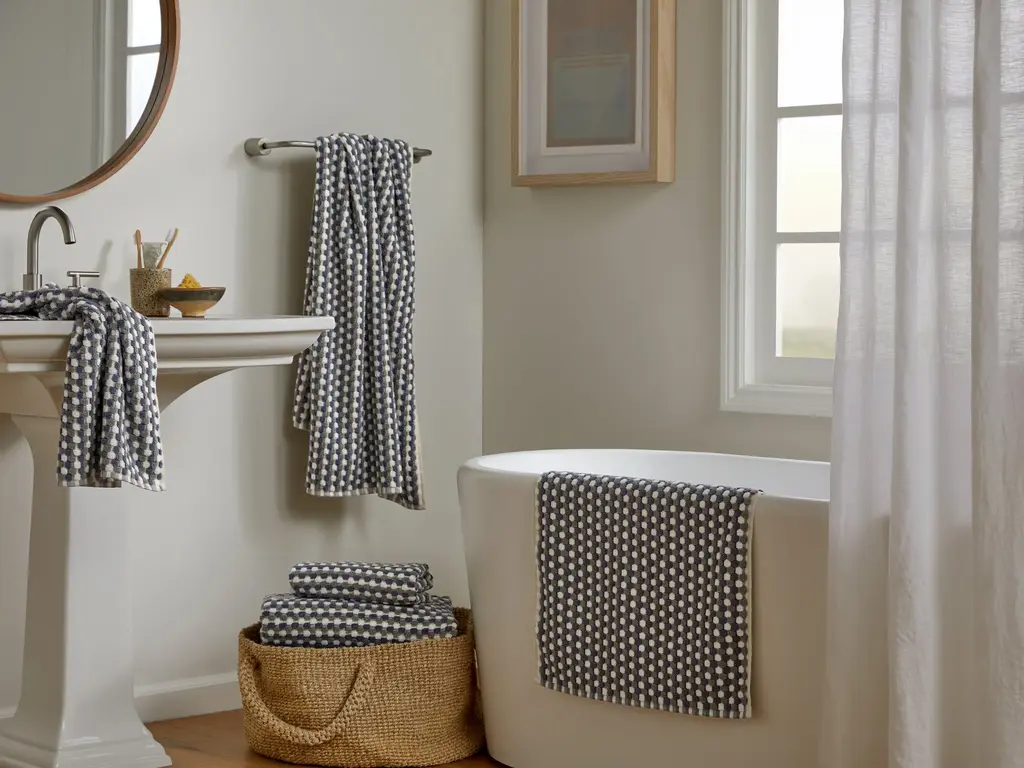 Replenish your towels with the 4 and 4, which bundles together four hand towels and four bath towels for savings and convenience. Inspired by hand-woven Turkish towels, our Organic Cotton Mosaic Collection is fashion-forward with a retro vibe. Made from organic cotton, its gentle-yet-durable weave features a stunning jacquard pattern. Mix and match with our existing towel assortment, or style solo in a statementbath.