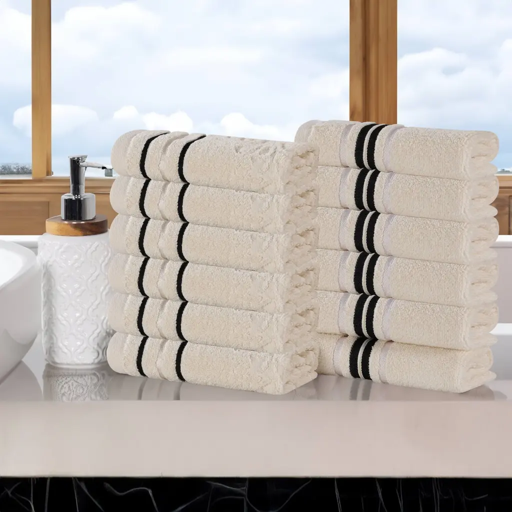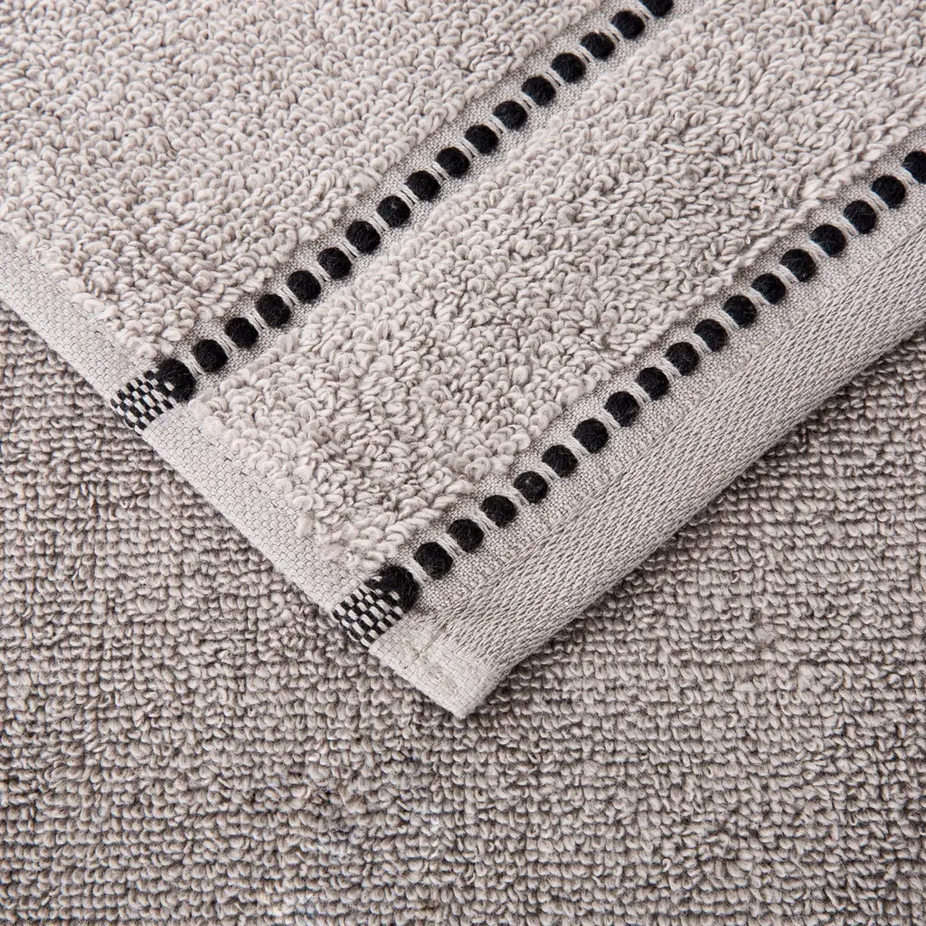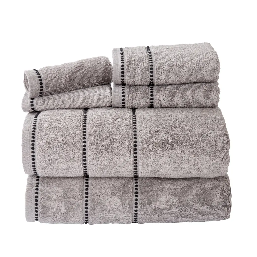Bring spa quality luxury to the comfort of your own bathroom with the 6-Piece Towel Set by Lavish Home. These super soft and plush towels for bathroom are made from 100% cotton with a zero-twist design for a faster dry. This set includes 2 bath towels, 2 hand towels, and 2 wash cloths with a stylish yet subtle pin stitch beaded border design that adds a touch of elegance to any décor.6-PIECE BATHROOM TOWEL SET – This 6-piece bath towel set comes with 2 bath towels, 2 bathroom hand towels, and 2 washcloths with a pin stitch beaded border. These bathroom towels come in a variety of color options to complement any bathroom.ABSORBENT AND QUICK DRYING – These cotton towels are made with zero-twist ends for increased absorbency while remaining lightweight. The hand towels for bathroom easily wick away moisture and are quick drying for use in your bathroom or washroom.QUALITY MATERIALS – The bathroom towels set is made of high quality 100% cotton, making it low maintenance and soft to the touch. Each bath towel is soft to the skin and provides plenty of warmth, all while remaining breathable and comfortable.MACHINE WASHABLE – This bath set is machine washable for your convenience. The cotton bathroom towels require washing before first use, wash warm with like colors, do not use bleach, and tumble dry low.PRODUCT DETAILS – Materials: 100% Cotton. Dimensions: Bath Towel: (L) 54” x (W) 27”; Hand Towel: (L) 28” x (W) 16”; Washcloth: (L) 12” x (W) 12”. Color: Silver and Black.