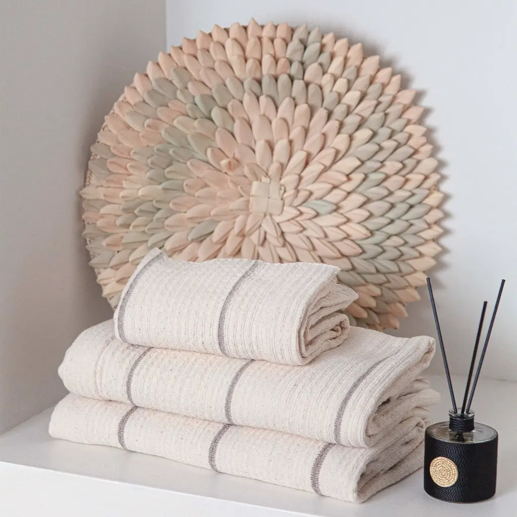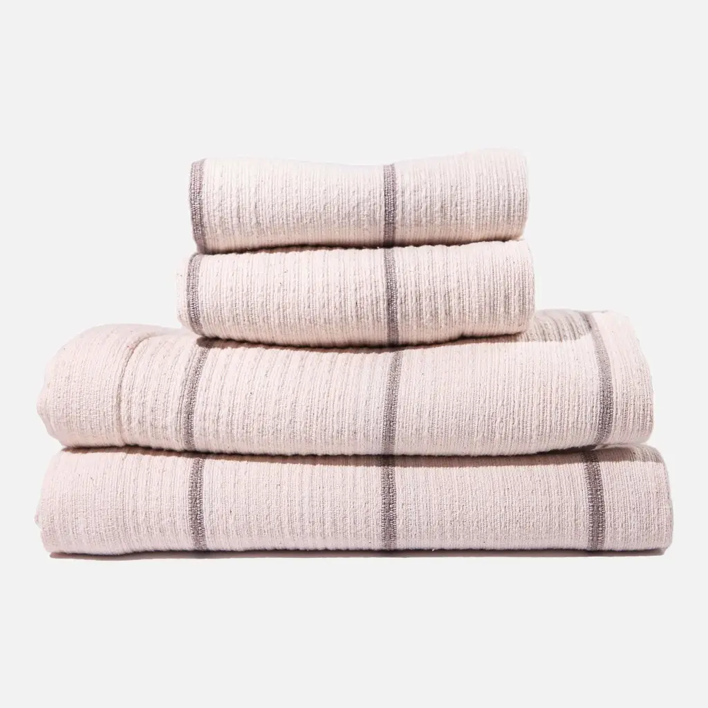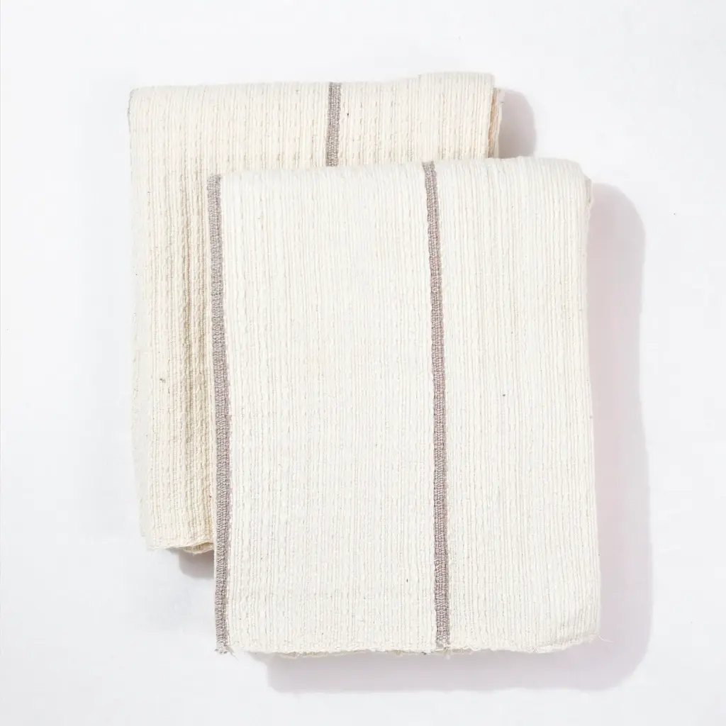 The Addis Gray Striped Hand Towel Set 2 is a pair of hand towels for bathroom that are handmade in Ethiopia from natural cotton. Special care and skill are put into the creation of each hand towel set. This results in luxurious, uniform and absorbent waffle weave bathroom hand towels. The design house is a member of the World Fair Trade Organization, which ensures that each worker receives a sustainable income. Place a set of these fingertip towels in a guest bathroom.