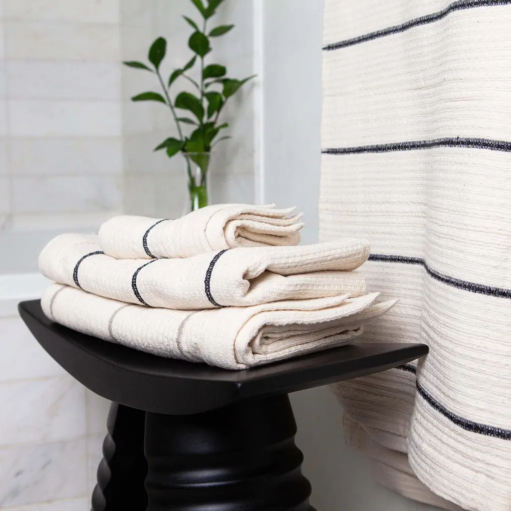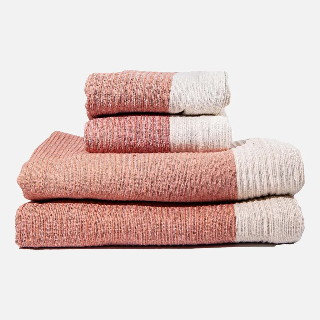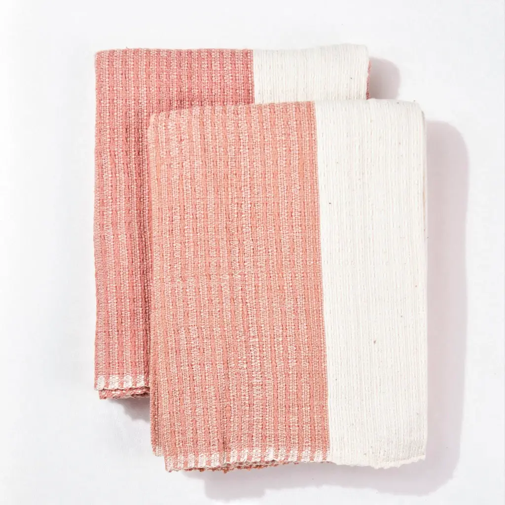 The Addis Pink Hand Towels Set 2 is made in Ethiopia from natural cotton. Master weavers achieve a flawlessly handwoven finish with the completion of each one. Mostly saturated with rich color, the cotton hand towels have a thin band of ivory across the bottom. The Addis pink hand towel set is a favorite to use in a bathroom or powder room.