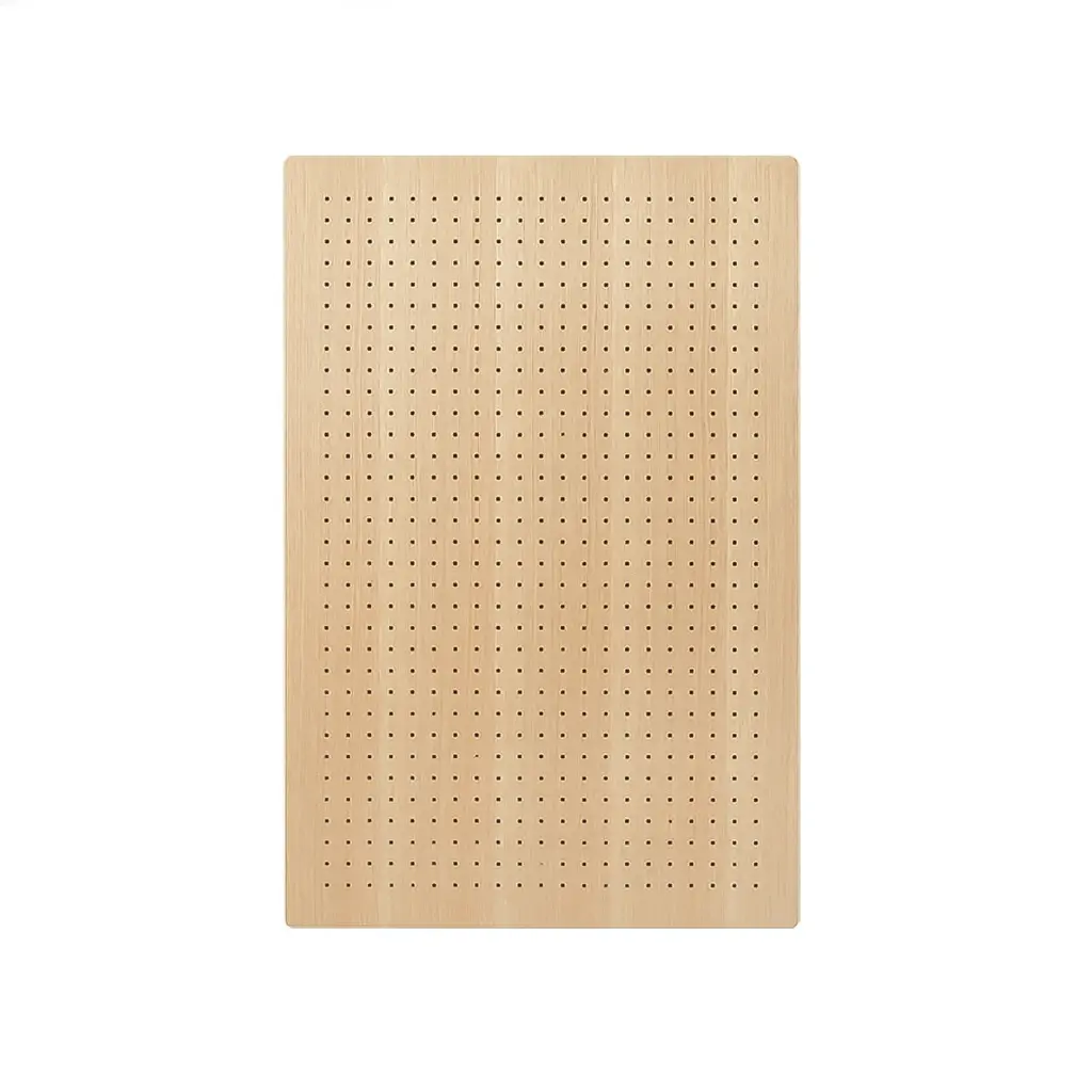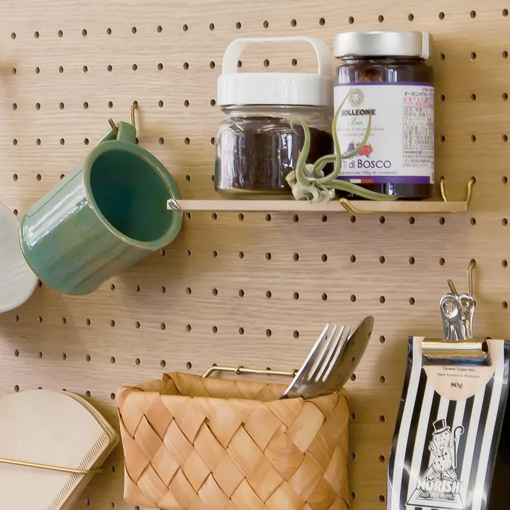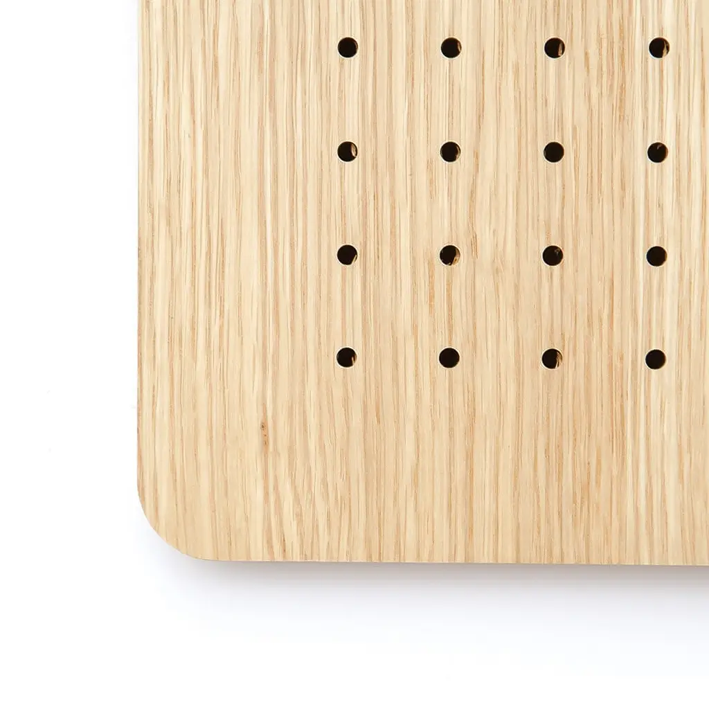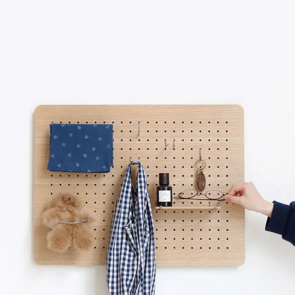 The classic pegboard, reimagined as a fun, easily customizable storage solution. Meet the Amabro Peg Wall – Oak, the perfect way to organize and display items while keeping them accessible. The small, medium and large sizes each offer practical answers to de-clutter your home. While the small pegboard has a square shape, the medium and large boards can be installed either vertically or horizontally. All three come with a range of handy accessories that transform the Amabro Peg Wall into a multi-functional design. The tray can hold small bottles, eyewear, or cups; the bar can be used for hand towels or scarves; and the hooks and loop can hold a variety of objects. Crafted from oak plywood, this customizable pegboard features a light color with subtle textures. The Amabro Peg Wall also comes in a darker walnut version.