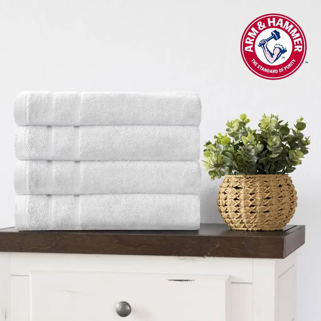 Experience the gentle luxury of towels designed especially for sensitive skin. Crafted from a unique blend of soft cotton and rayon from bamboo, these advanced towels offer enduring softness without harmful irritants. Lower-lint and effortlessly machine washable, they maintain their pristine appearance over time. With antimicrobial protection, these Arm & Hammer™ towels stay fresher for longer, effectively resisting mildew odors. Elevate your self-care routine with towels specifically made for the comfort of sensitive skin.