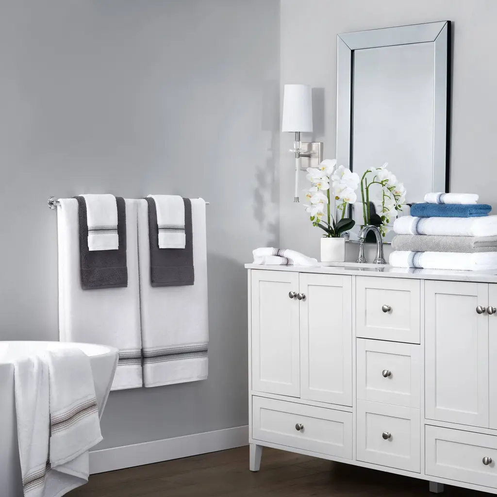 Made from the finest quality Aegean ring spun cotton, Aston & Arden bathroom towel collection features a low twist for the ultimate feeling of soft fluffiness. We took no shortcuts with these Turkish towel sets for bathroom. Refusing to compromise on quality, our luxury towel sets are made with high-quality Aegean Turkish cotton. Our classic white towels with an ombre striped border brighten up any bathroom. All of our Turkish bath towels are oversized and thicker than regular bath towels. The premium bathroom towel sets are available in trending colors to suit a modern bathroom. Always wash new bath towels set before use as some lint may be generated after the first wash. Machine Wash with like colors. Do not bleach. Tumble dry low. Quality means longevity. If you care for your bath towel sets properly, your extra-large bath towels will look new and fresh even after multiples washes.