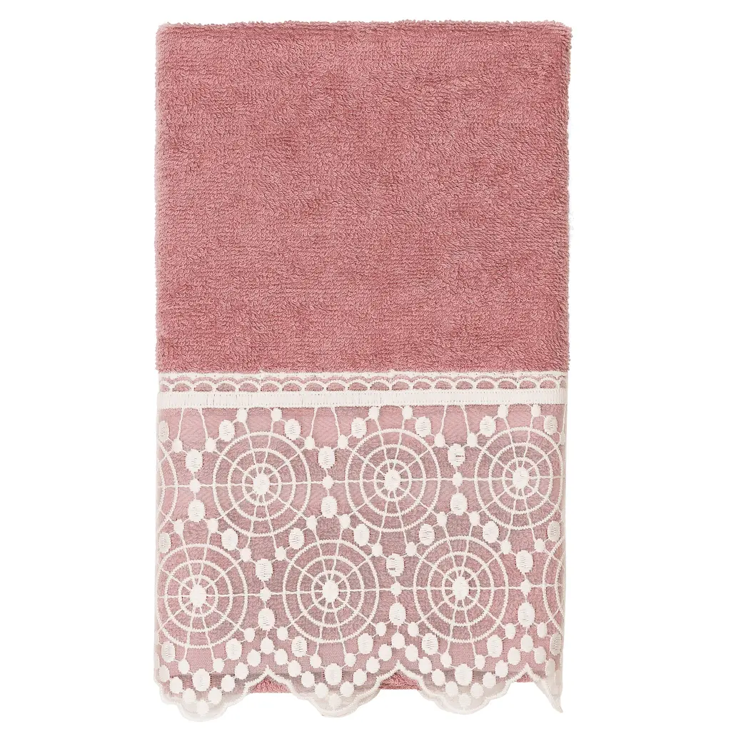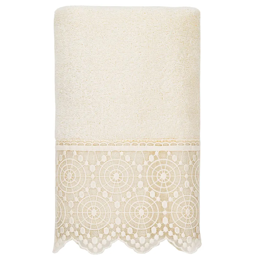 The Arian Lace Towel Collection by Authentic Hotel and Spa features an elegant circles motif, embroidered on a cream organza lace border with scalloped bottom edge. These soft and luxurious towels are made of 100% premium Turkish Cotton and offer lasting absorbency and superior durability. The Arian Lace Collection will bring a sophisticated note to your bath decor.100% Premium Turkish CottonSuperbly absorbent and quick dryingAvailable in a range of lovely towel colorsMachine wash cold, No bleach, line dry or dry cleanIncludes 1 hand towel (16" x 30")Made in TurkeyProudly Embellished in USA