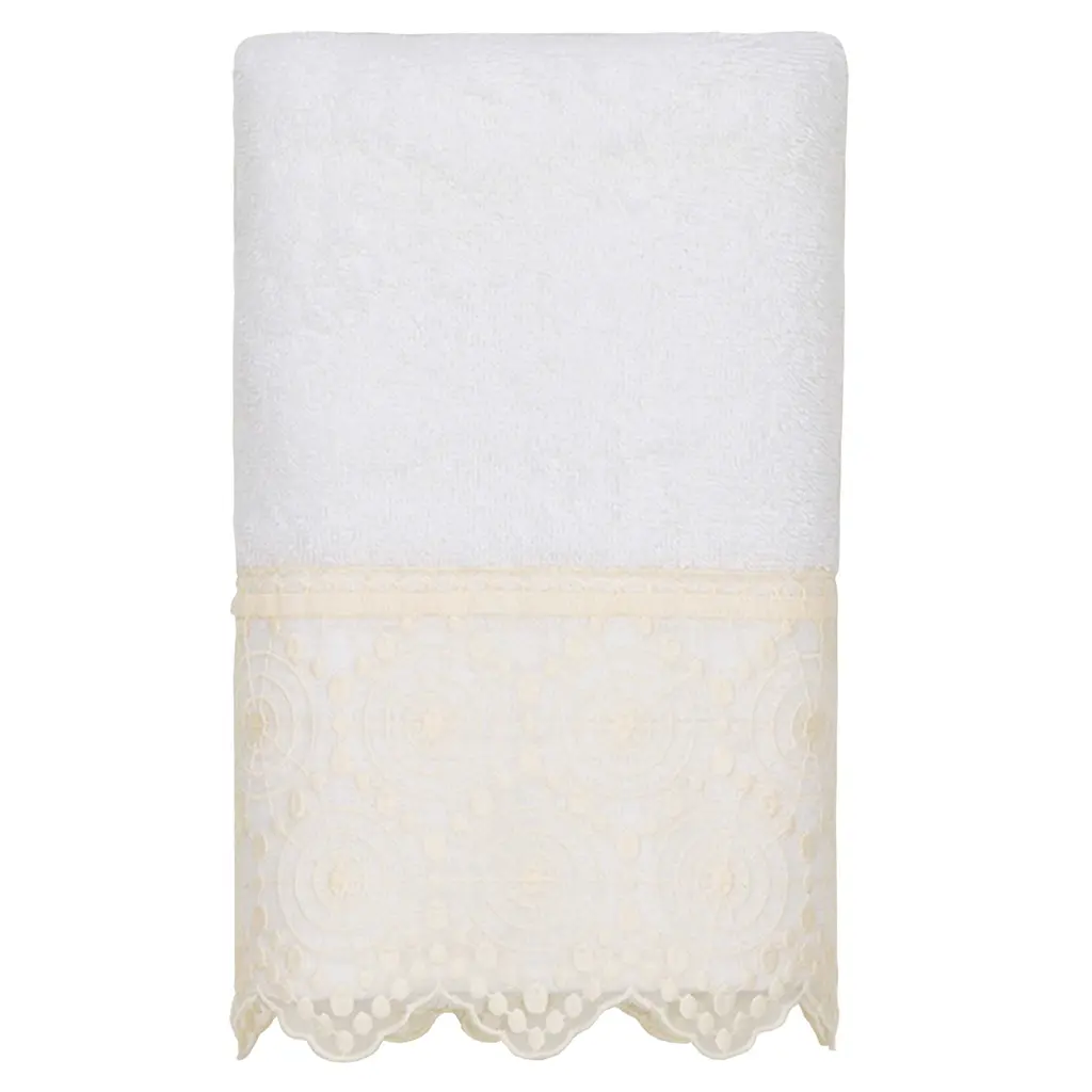 The Arian Lace Towel Collection by Authentic Hotel and Spa features an elegant circles motif, embroidered on a cream organza lace border with scalloped bottom edge. These soft and luxurious towels are made of 100% premium Turkish Cotton and offer lasting absorbency and superior durability. The Arian Lace Collection will bring a sophisticated note to your bath decor.100% Premium Turkish CottonSuperbly absorbent and quick dryingAvailable in a range of lovely towel colorsMachine wash cold, No bleach, line dry or dry cleanIncludes 1 hand towel (16" x 30")Made in TurkeyProudly Embellished in USA