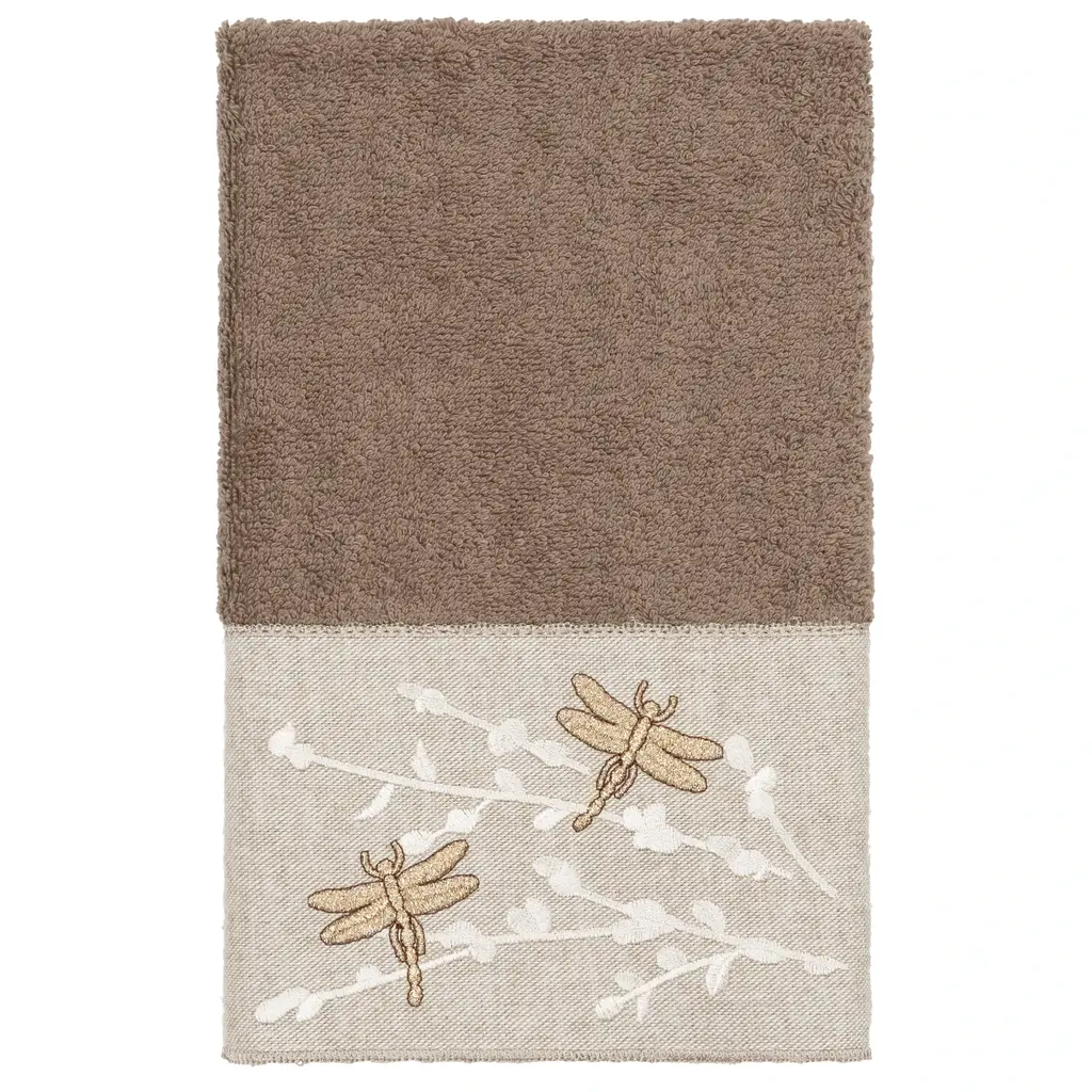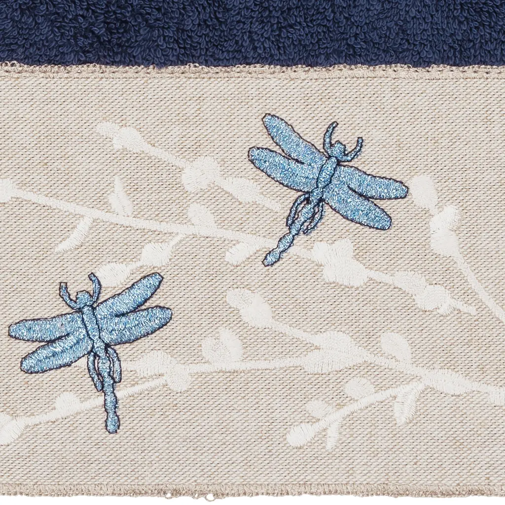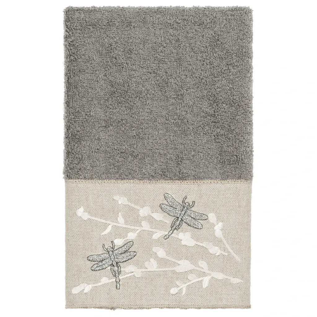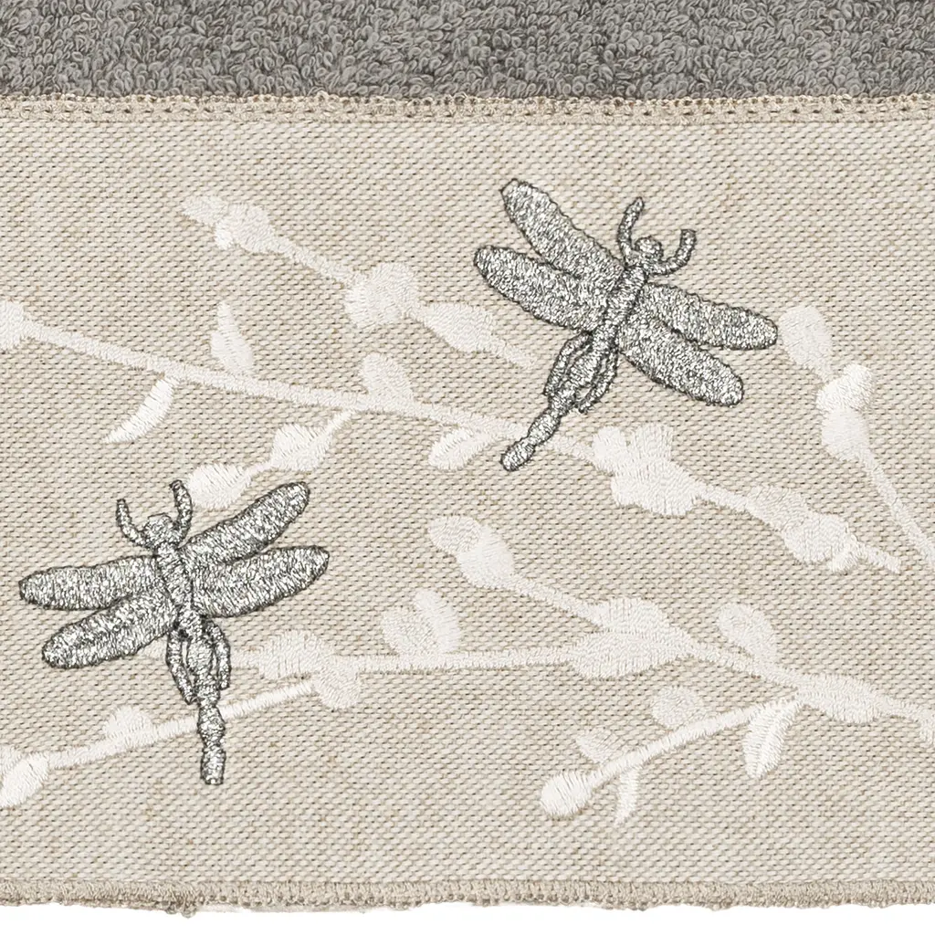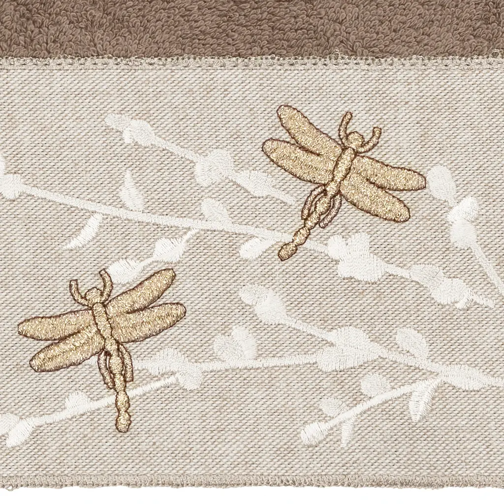 The Braelyn Embellished Towel Collection features glittering dragonflies flying among delicate branches embroidered on a linen-look textured woven cloth border. These soft and luxurious towels are made of 100% premium Turkish Cotton and offer lasting absorbency and superior durability.100% Premium Turkish Cotton Superbly absorbent and quick drying Available in a range of lovely towel colors Machine wash cold, No bleach, line dry or dry clean Includes 1 hand towel (16" x 30") Made in Turkey Proudly Embellished in USA