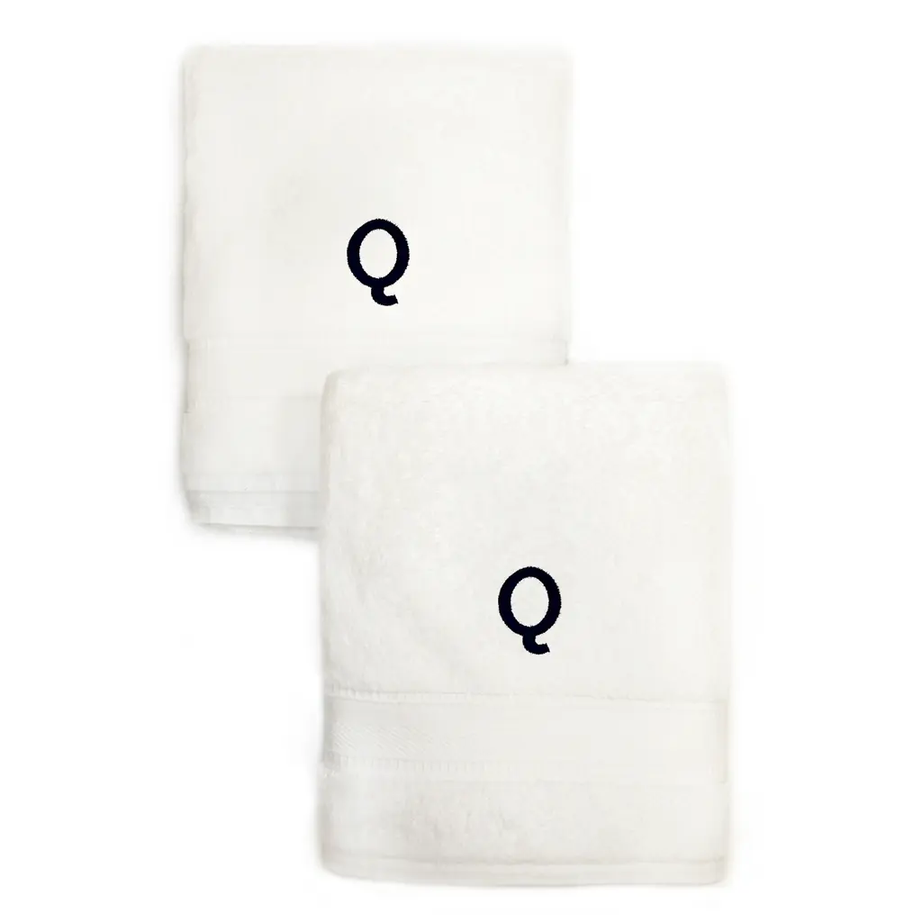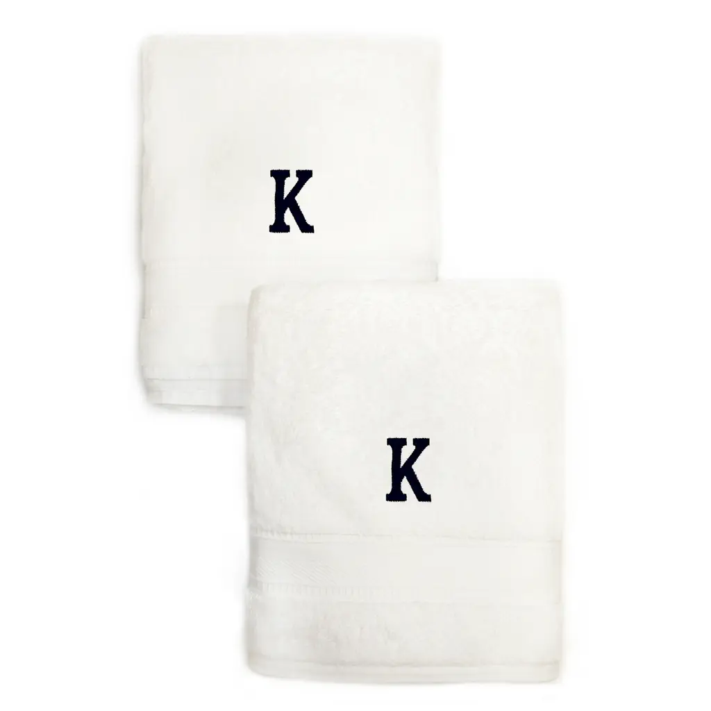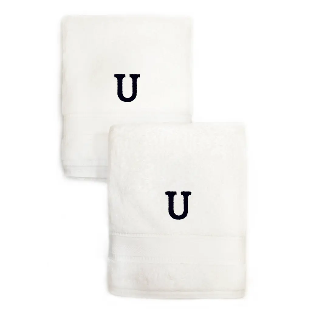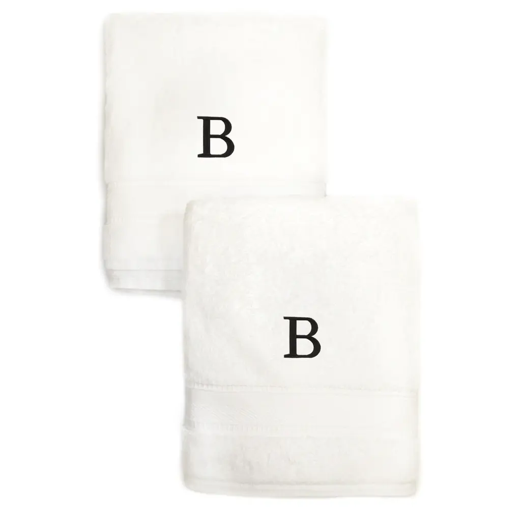 These authentic plush hotel and spa hand towels are made from high end Turkish cotton with a beautiful embroidered initial of your choice monogrammed on each towel. These 700 gram Turkish cotton bath towels are made for 5 star luxury hotels and spas and become softer and more absorbent with every wash.Soft, thick and absorbentThese long lasting towels are designed for heavy use and become softer with each washWill not pill or shedIncludes set of 2 hand towelPattern: White embroidered with the initial of your choice in black block letteringType of cotton: TurkishConstruction: Looped terryclothMaterials: 100 percent Turkish cottonCare instructions: Machine washableMade in TurkeyDimensions: 16 inches wide x 30 inches long The digital images we display have the most accurate color possible. However, due to differences in computer monitors, we cannot be responsible for variations in color between the actual product and your screen.Product Features: MonogrammedMaterial: Turkish CottonPattern: Embroidered, Solid ColorSet Include: 2 PieceCare Instruction: Machine WashTowel: Hand Towels, Guest TowelsColor: White, Black Product Features: MonogrammedMaterial: Turkish CottonPattern: Embroidered, Solid ColorSet Include: 2 PieceCare Instruction: Machine WashTowel: Hand Towels, Guest TowelsColor: White, Black