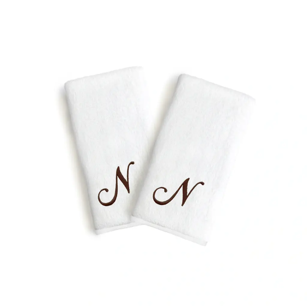 Enjoy spa-like elegance at home with these monogrammed hand towels. Made from luxuriously soft and absorbent Turkish cotton, these towels resist pilling and shedding for lasting use.Includes set of two (2) hand towelsSoft, thick and very absorbentLong-lasting towels designed for heavy useBecome softer with each washWill not pill or shedPattern: Solid with an embroidered brown script initial of your choiceMaterials: 100 percent Turkish cottonColor: White with brown initialCare instructions: Machine washableMade in TurkeyDimensions: 16 inches x 30 inchesSet Includes: 2 PieceProduct Features: Monogrammed, Eco-FriendlyMaterial: Turkish CottonPattern: Solid Color, EmbroideredCare Instruction: Machine WashTowel: Hand Towels, Guest Towels, DecorativeColor: White, Brown