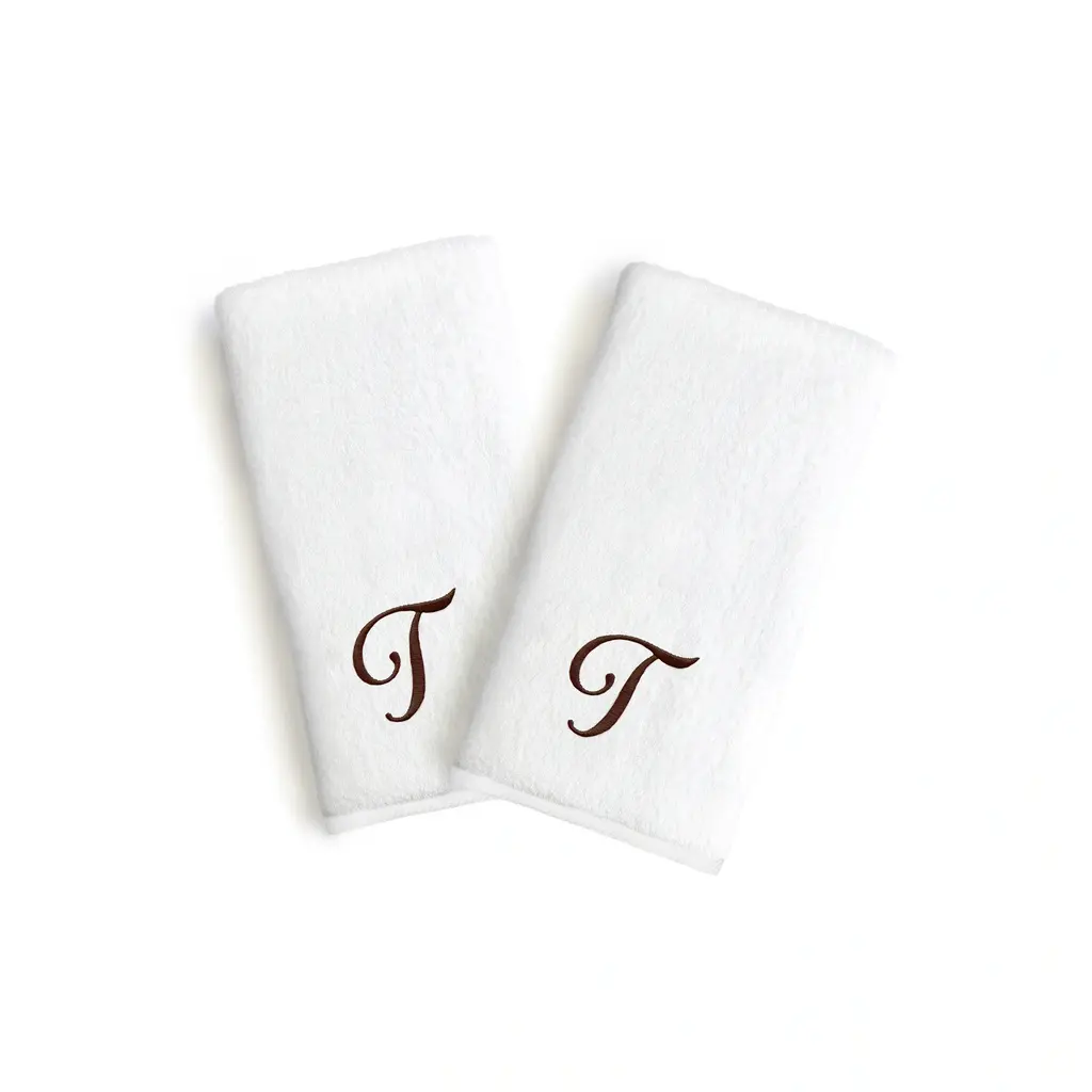 Authentic Hotel And Spa 2-Piece White Turkish Cotton Hand Towels With Brown Script Monogrammed Initial - White/f