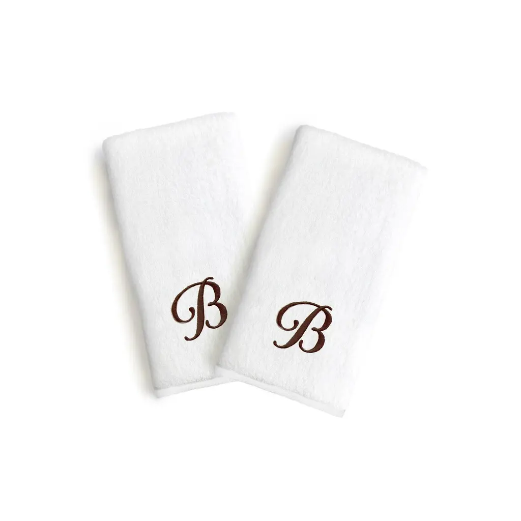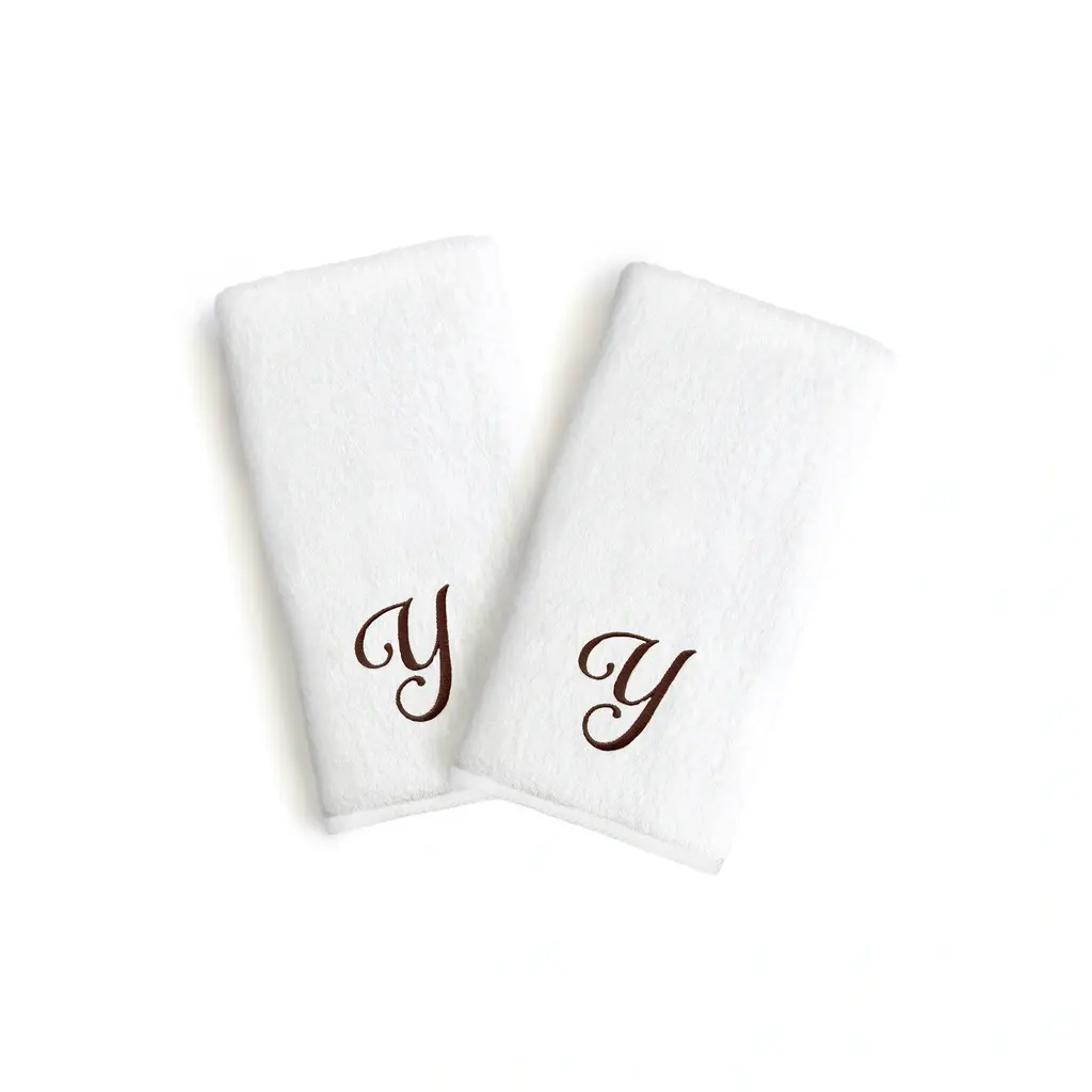 Enjoy spa-like elegance at home with these monogrammed hand towels. Made from luxuriously soft and absorbent Turkish cotton, these towels resist pilling and shedding for lasting use.Includes set of two (2) hand towelsSoft, thick and very absorbentLong-lasting towels designed for heavy useBecome softer with each washWill not pill or shedPattern: Solid with an embroidered brown script initial of your choiceMaterials: 100 percent Turkish cottonColor: White with brown initialCare instructions: Machine washableMade in TurkeyDimensions: 16 inches x 30 inchesSet Includes: 2 PieceProduct Features: Monogrammed, Eco-FriendlyMaterial: Turkish CottonPattern: Solid Color, EmbroideredCare Instruction: Machine WashTowel: Hand Towels, Guest Towels, DecorativeColor: White, Brown