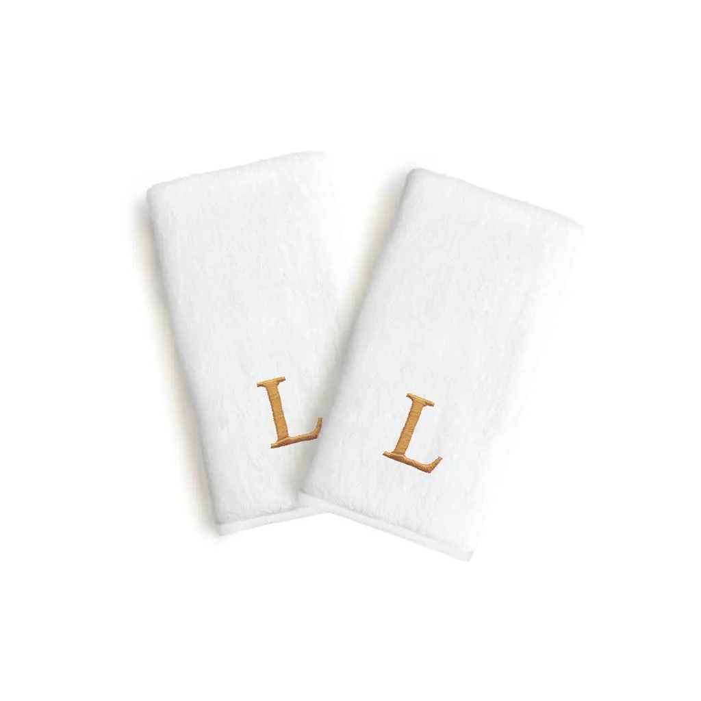 Place these white Turkish cotton hand towels with gold monogrammed initials in your bathroom to make it feel like a luxurious hotel. These thick and absorbent towels give you a pleasantly clean, dry feeling.Includes set of two (2) hand towelsSoft, thick and very absorbentLong-lasting towels designed for heavy useBecome softer with each washWill not pill or shedPattern: Solid with an embroidered gold block initial of your choiceMaterials: 100 percent Turkish cottonColor: White with gold initialCare instructions: Machine washableMade in TurkeyDimensions: 16 inches x 30 inchesSet Includes: 2 PieceProduct Features: Monogrammed, Eco-FriendlyMaterial: Turkish CottonPattern: Solid Color, EmbroideredCare Instruction: Machine WashTowel: Hand Towels, Guest Towels, DecorativeColor: White, Gold