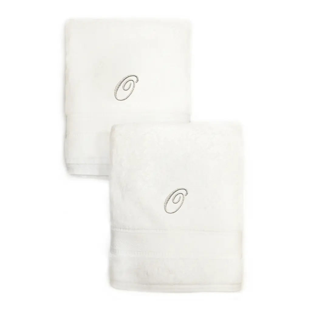These authentic plush hotel and spa hand towels are made from high end Turkish cotton with a beautiful embroidered silver script initial of your choice monogrammed on each towel. These 700 gram Turkish cotton bath towels are made for 5 star luxury hotels and spas and become softer and more absorbent with every wash. The digital images we display have the most accurate color possible. However, due to differences in computer monitors, we cannot be responsible for variations in color between the actual product and your screen. Soft, thick and very absorbentThese long lasting towels are designed for heavy use and become softer with each washWill not pill or shedIncludes set of 2 hand towelPattern: White embroidered with the initial of your choice in silver scriptType of cotton: TurkishConstruction: Looped terryclothMaterials: 100 percent Turkish cottonCare instructions: Machine washableMade in TurkeyDimensions: 16 inches wide x 30 inches long Product Features: Monogrammed Material: Turkish Cotton Pattern: Embroidered, Solid Color Set Include: 2 Piece Care Instruction: Machine Wash Towel: Hand Towels, Guest Towels Color: White, Silver