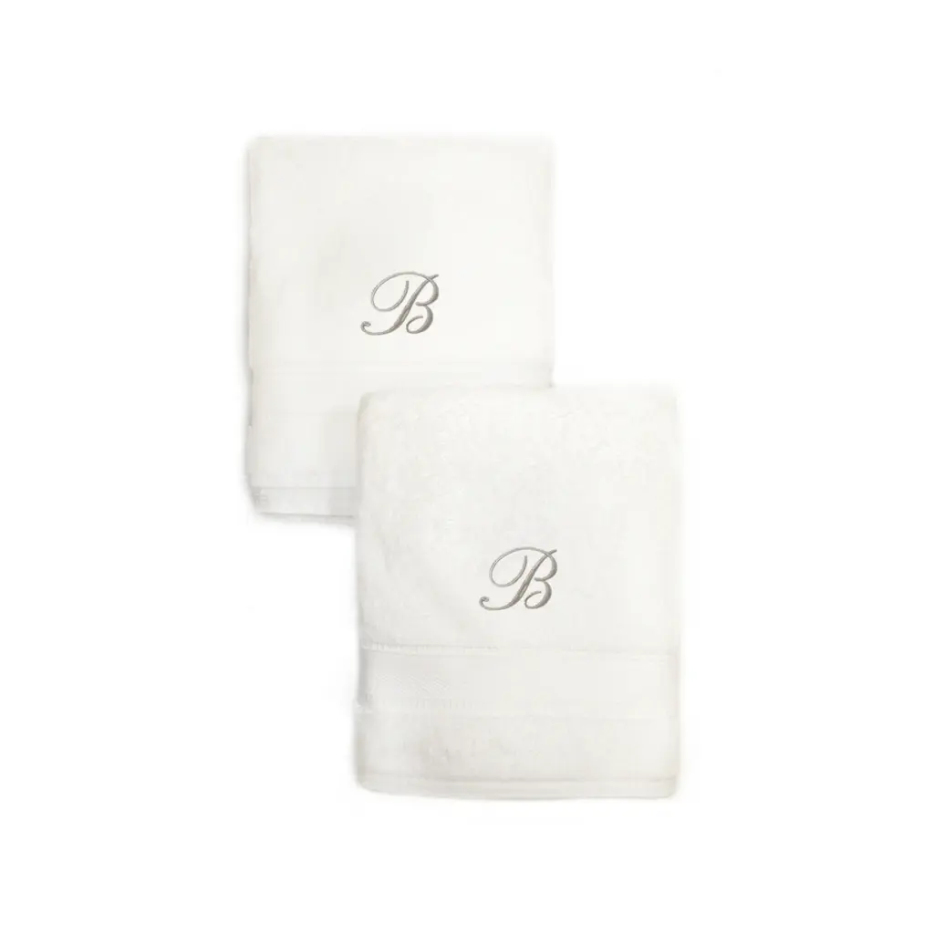 These authentic plush hotel and spa hand towels are made from high end Turkish cotton with a beautiful embroidered silver script initial of your choice monogrammed on each towel. These 700 gram Turkish cotton bath towels are made for 5 star luxury hotels and spas and become softer and more absorbent with every wash. The digital images we display have the most accurate color possible. However, due to differences in computer monitors, we cannot be responsible for variations in color between the actual product and your screen. Soft, thick and very absorbentThese long lasting towels are designed for heavy use and become softer with each washWill not pill or shedIncludes set of 2 hand towelPattern: White embroidered with the initial of your choice in silver scriptType of cotton: TurkishConstruction: Looped terryclothMaterials: 100 percent Turkish cottonCare instructions: Machine washableMade in TurkeyDimensions: 16 inches wide x 30 inches long Product Features: Monogrammed Material: Turkish Cotton Pattern: Embroidered, Solid Color Set Include: 2 Piece Care Instruction: Machine Wash Towel: Hand Towels, Guest Towels Color: White, Silver